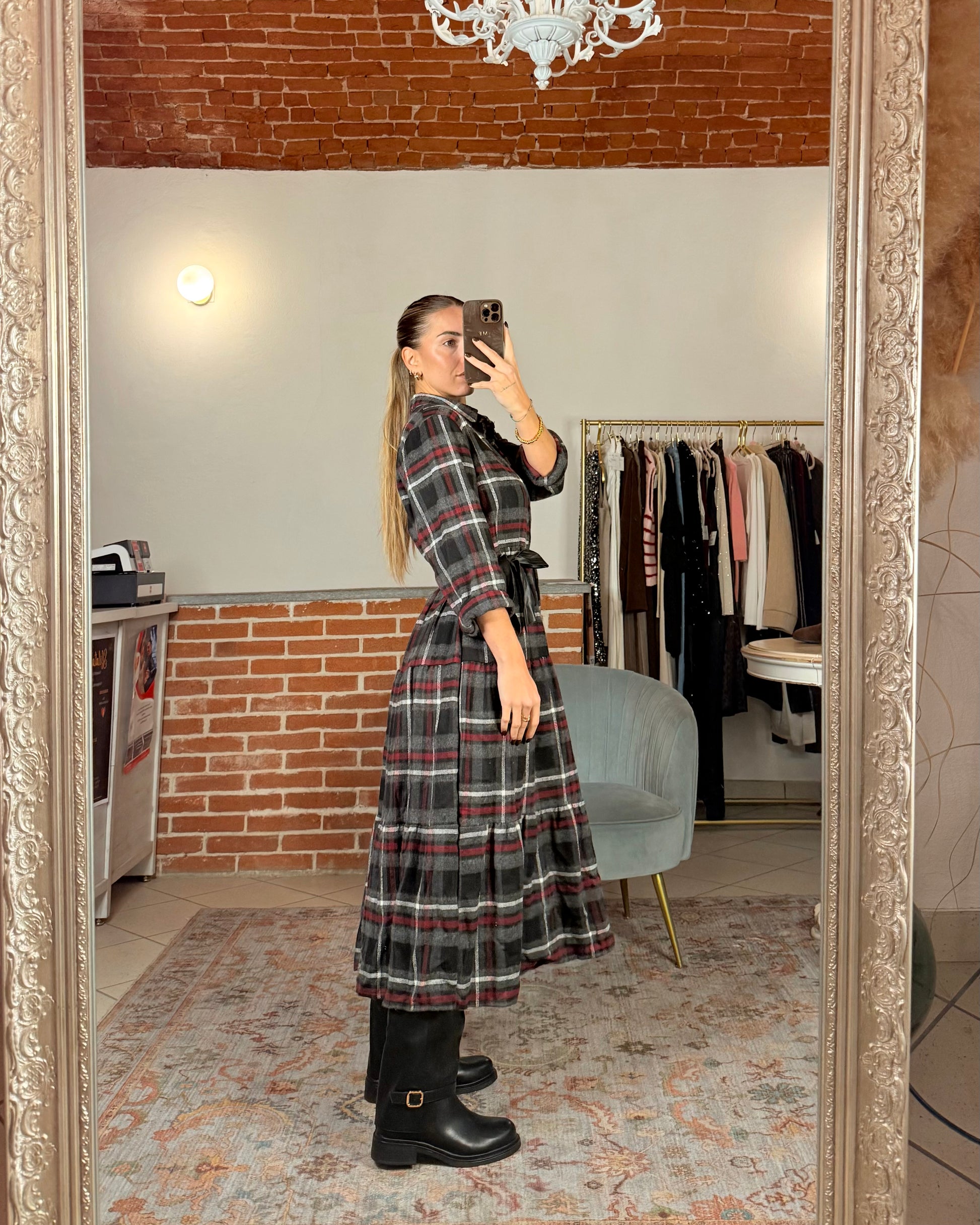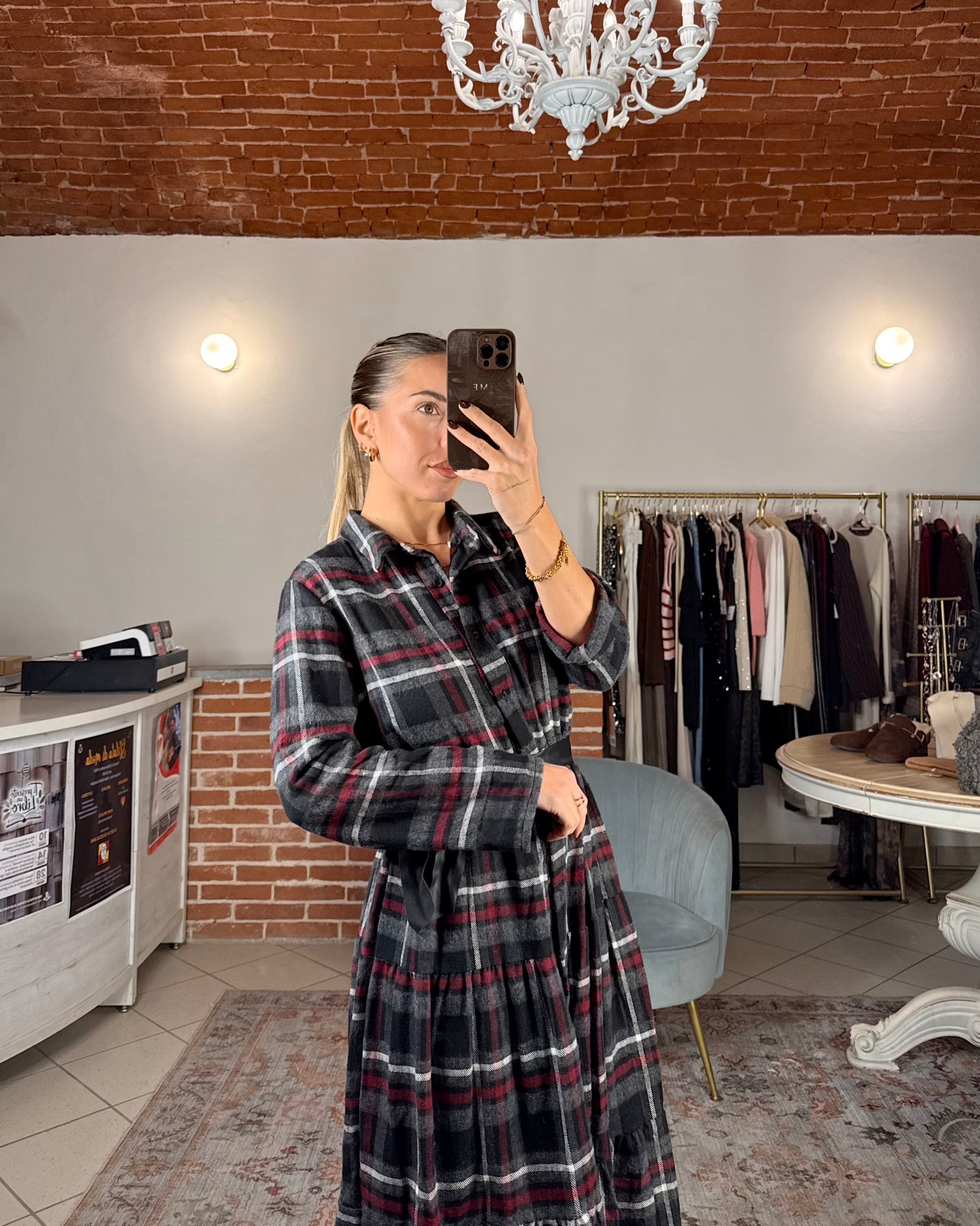 100% cotton flannel shirt dress with long sleeves (rolled up in the photo) and buttons along its entire length.