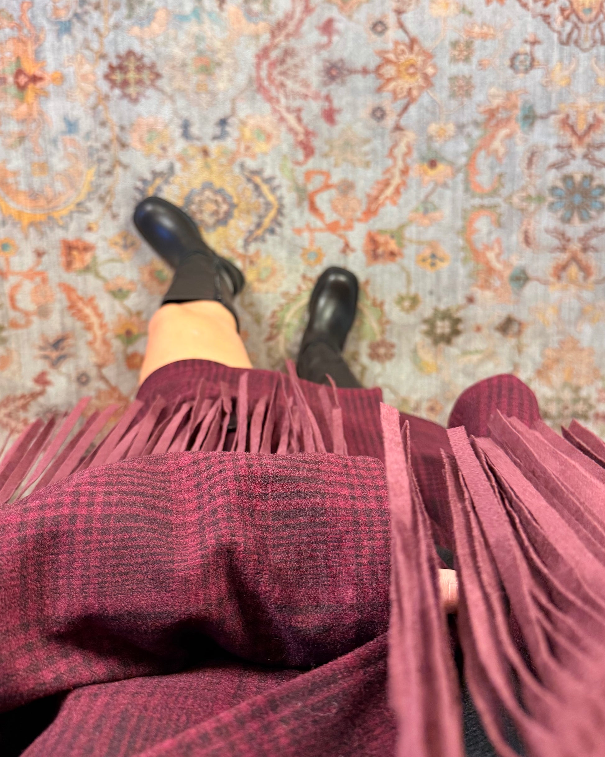 Blazer oversize doppiopetto in panno con frange, tasche laterali, foderato all’interno.