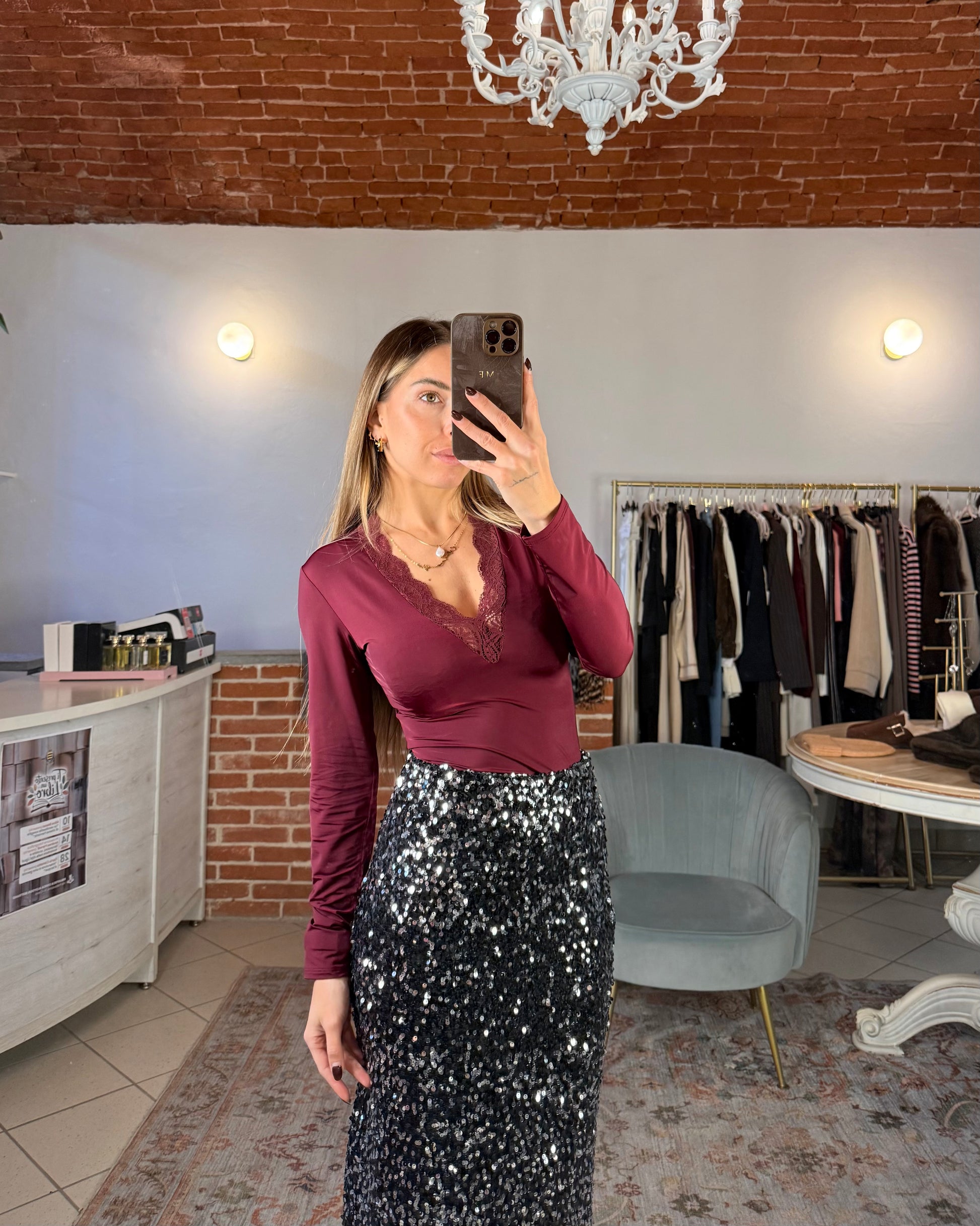 Body in lycra elasticizzato con scollo a V e profilo della scollatura in pizzo tono su tono.