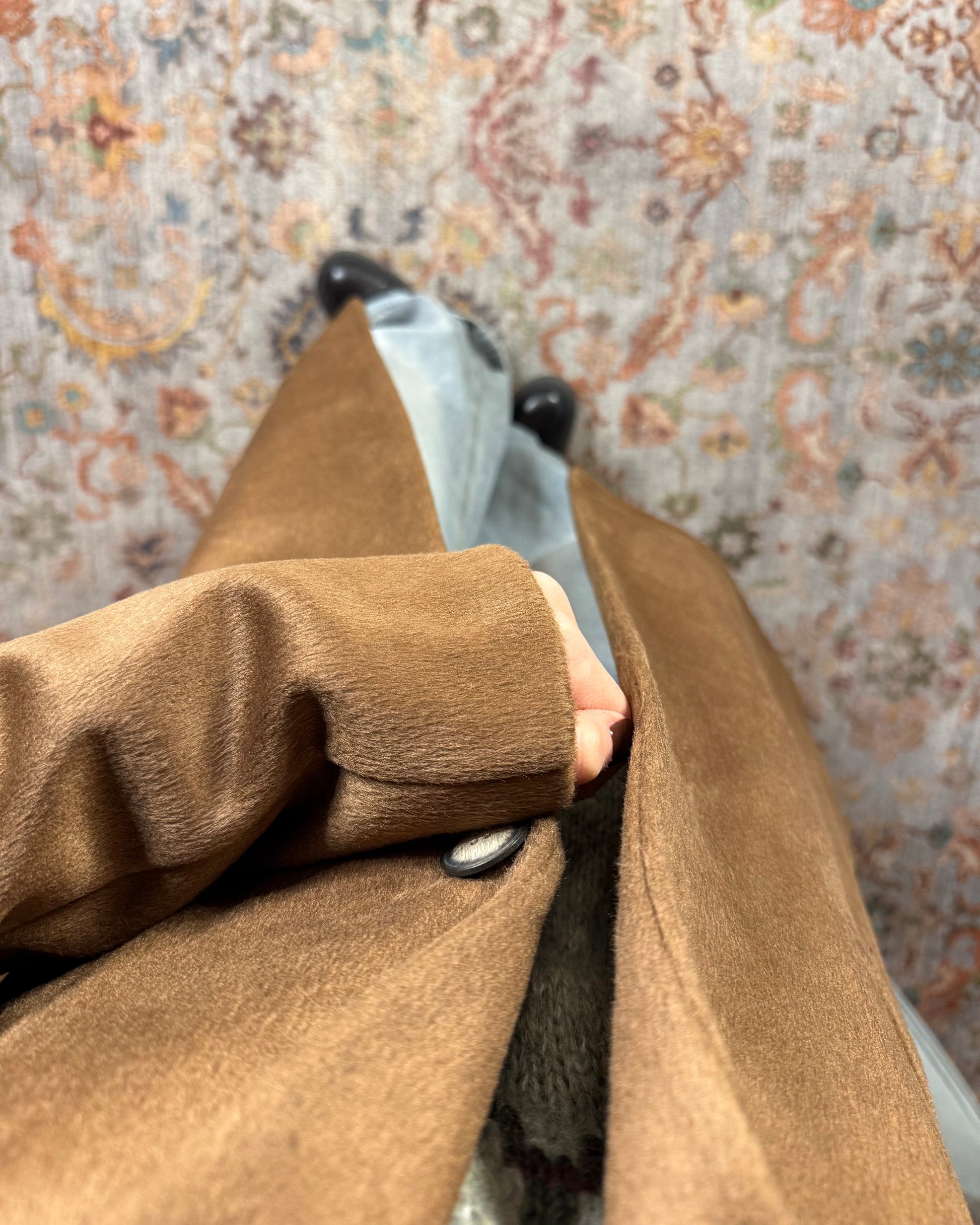Cappotto lunghezza media con doppio bottone, fodera interna e tasche.
