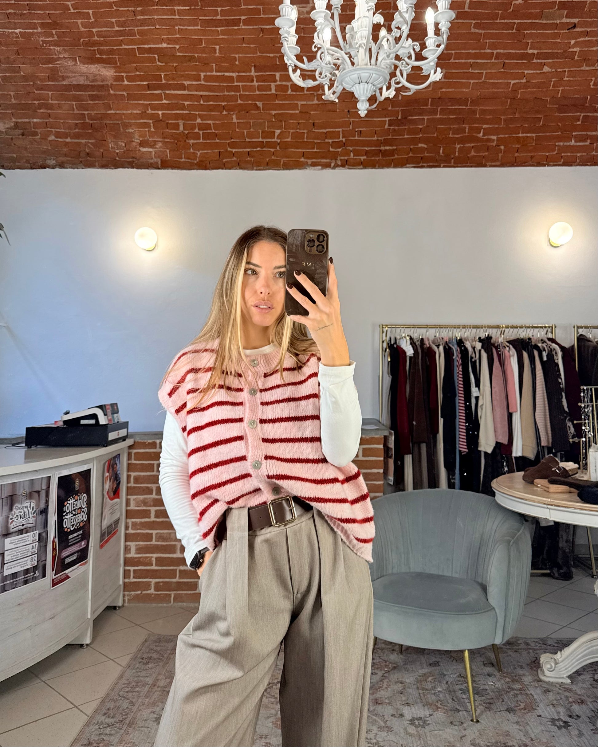 Knitted vest with mother-of-pearl buttons. One size fits all.