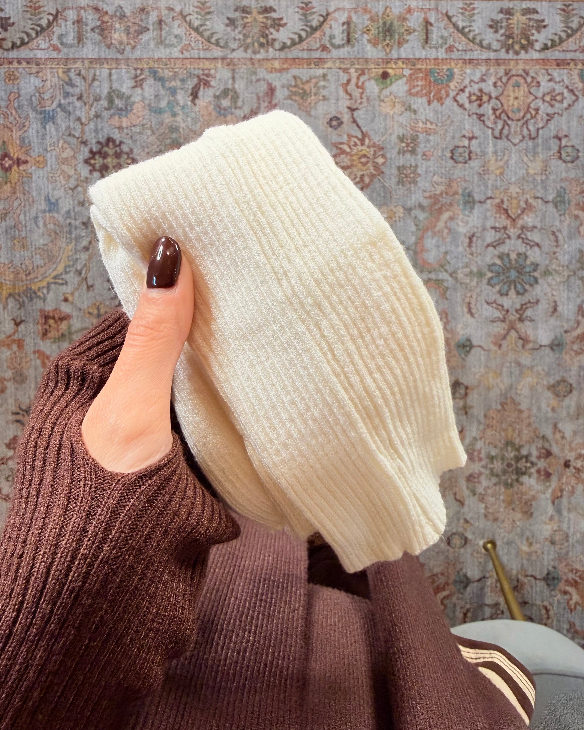 Elbow-length ribbed knit gloves, stretchy and soft, perfect under wide-sleeved shirts, jackets and coats. One size fits all.