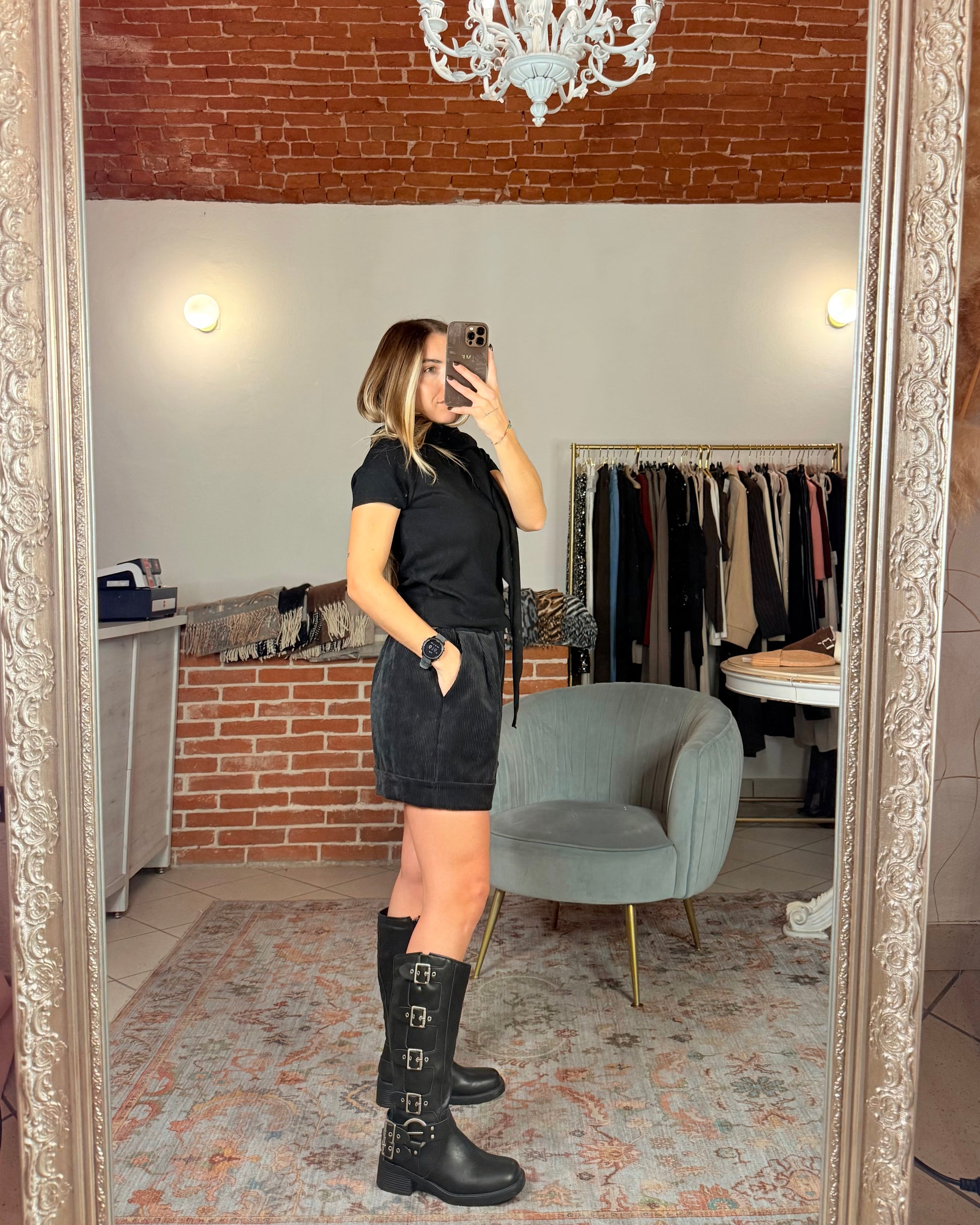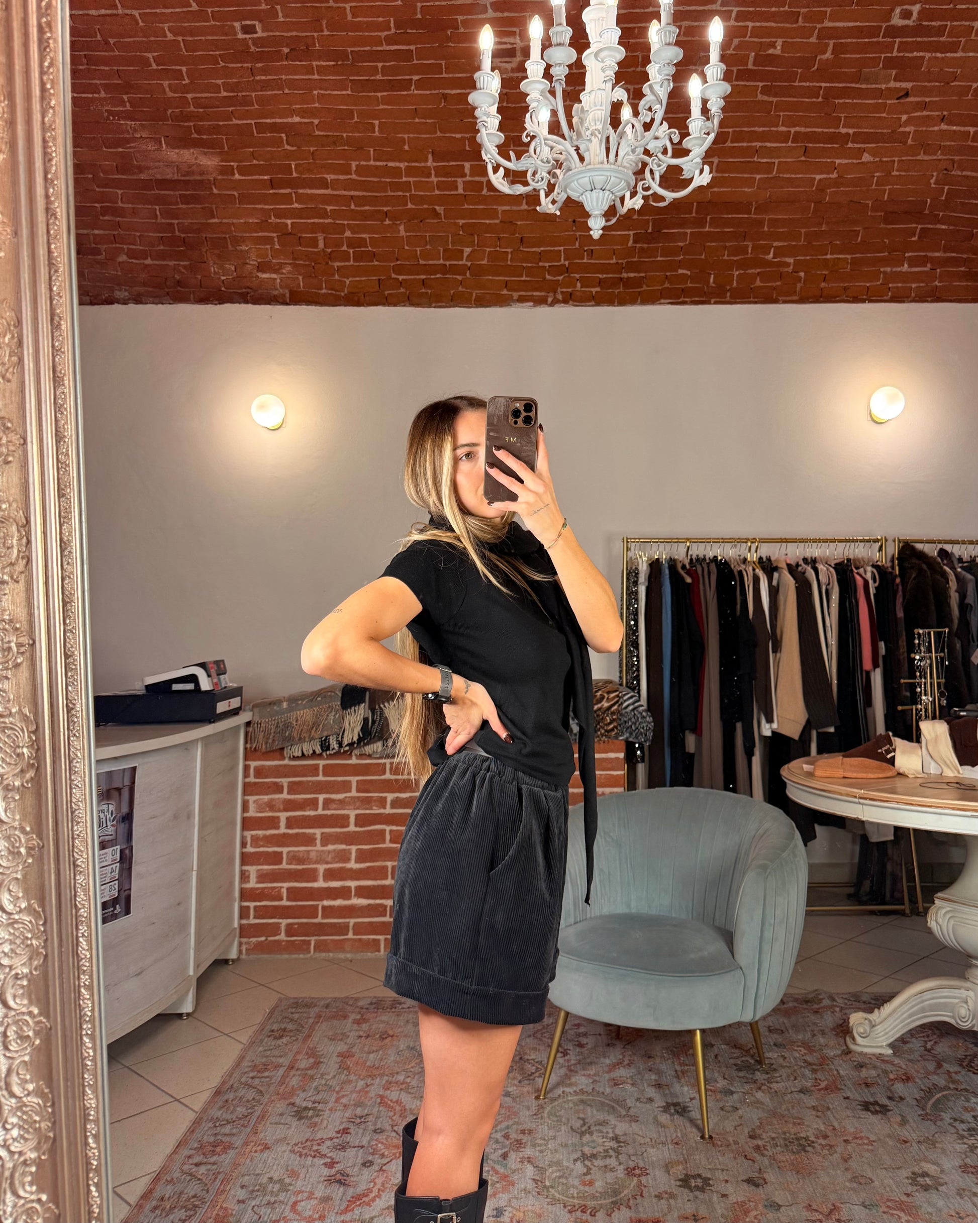 Pantaloncino in velluto con elastico in vita e risvolto. Taglia unica, veste da una xs ad una l.
