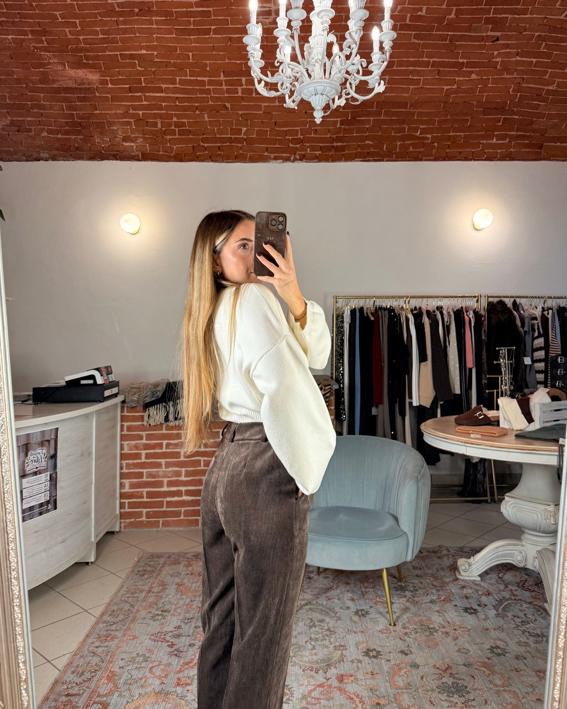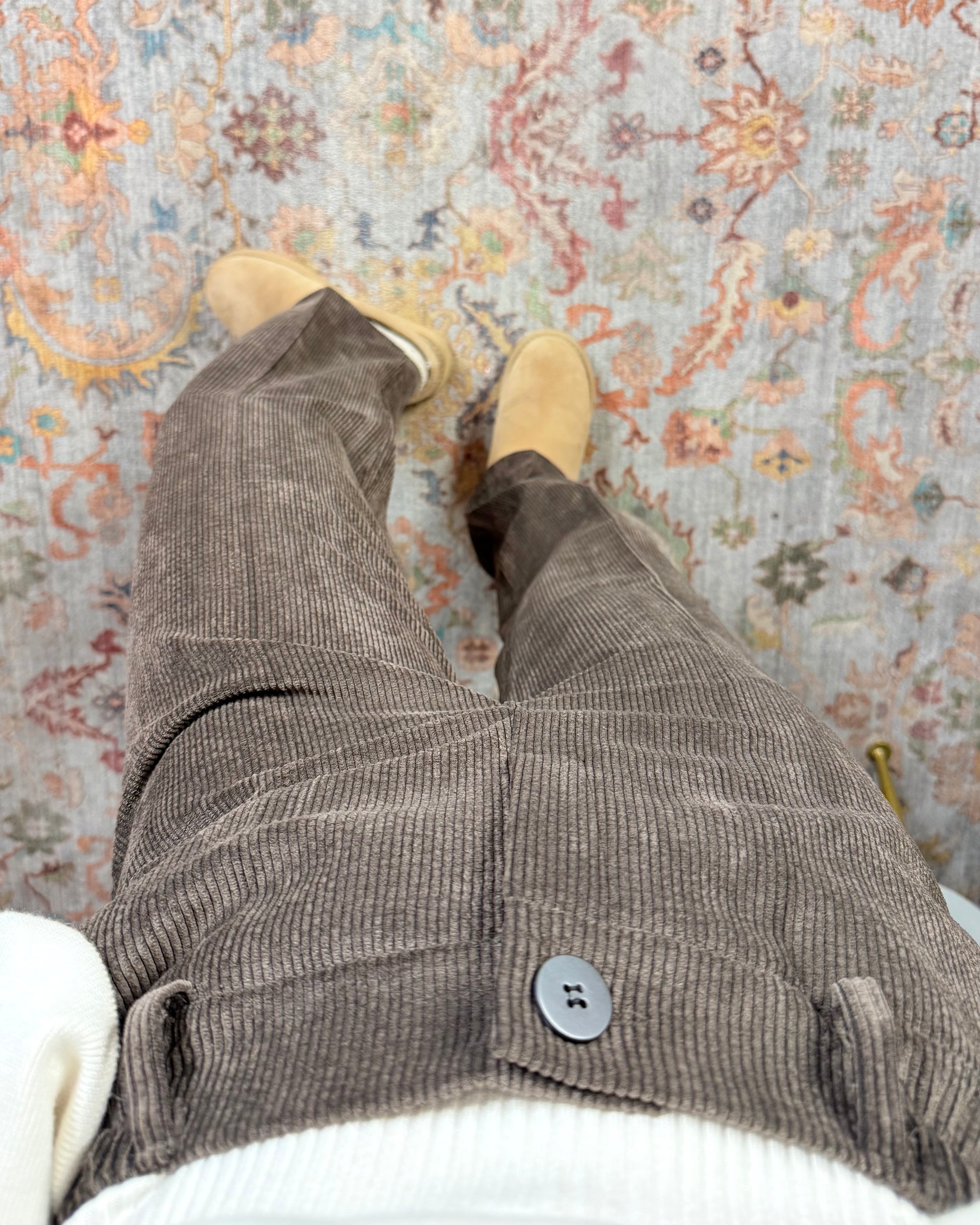 Pantalone a sigaretta in velluto con elastico sul fianco.