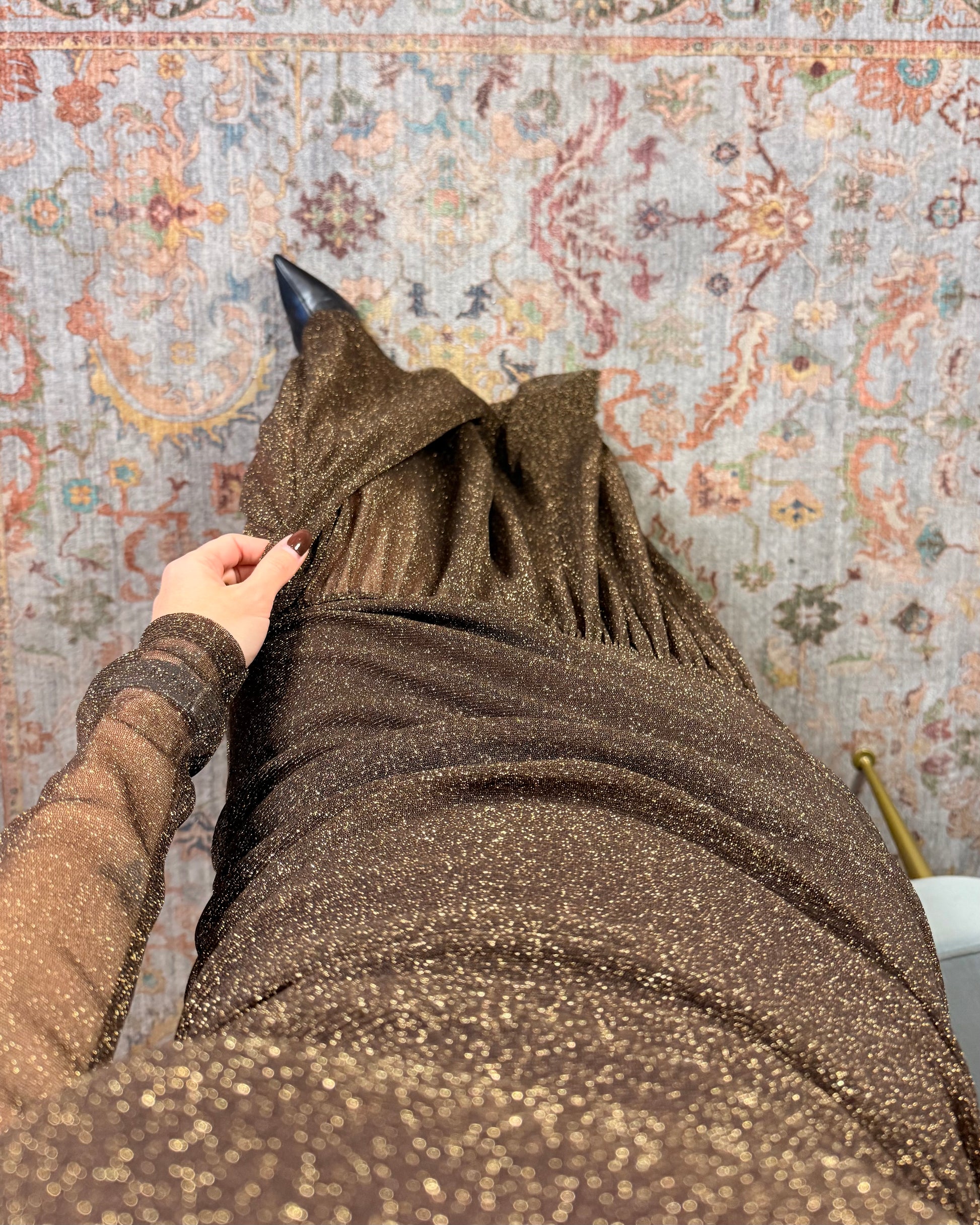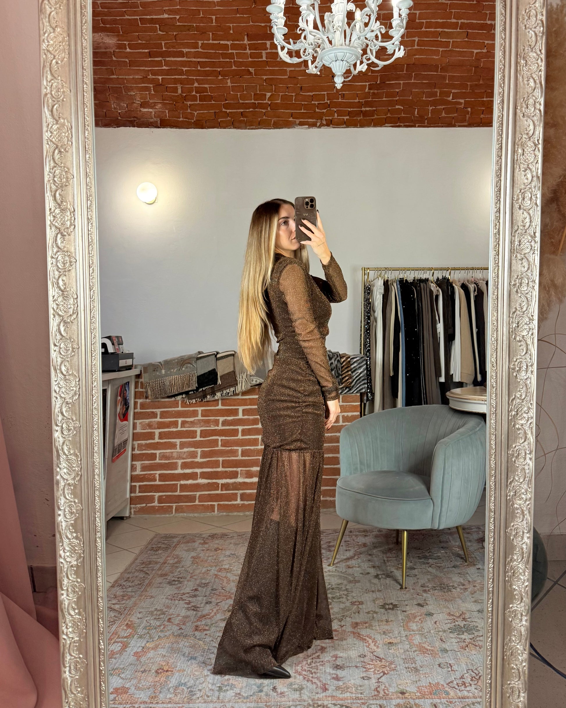 Robe longue à col roulé en tulle marron foncé avec lurex doré. Taille unique, extensible. Convient aux tailles XS à L.