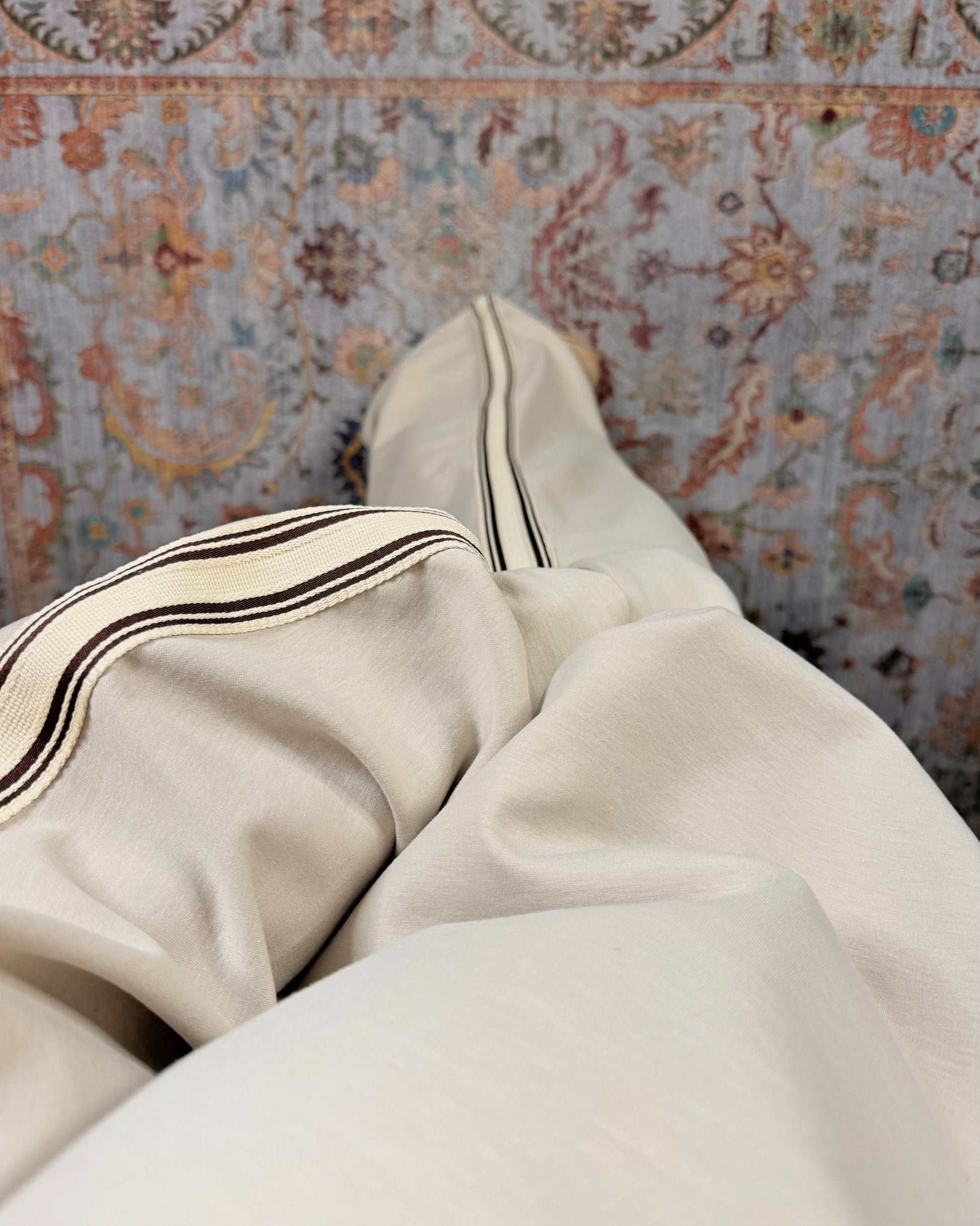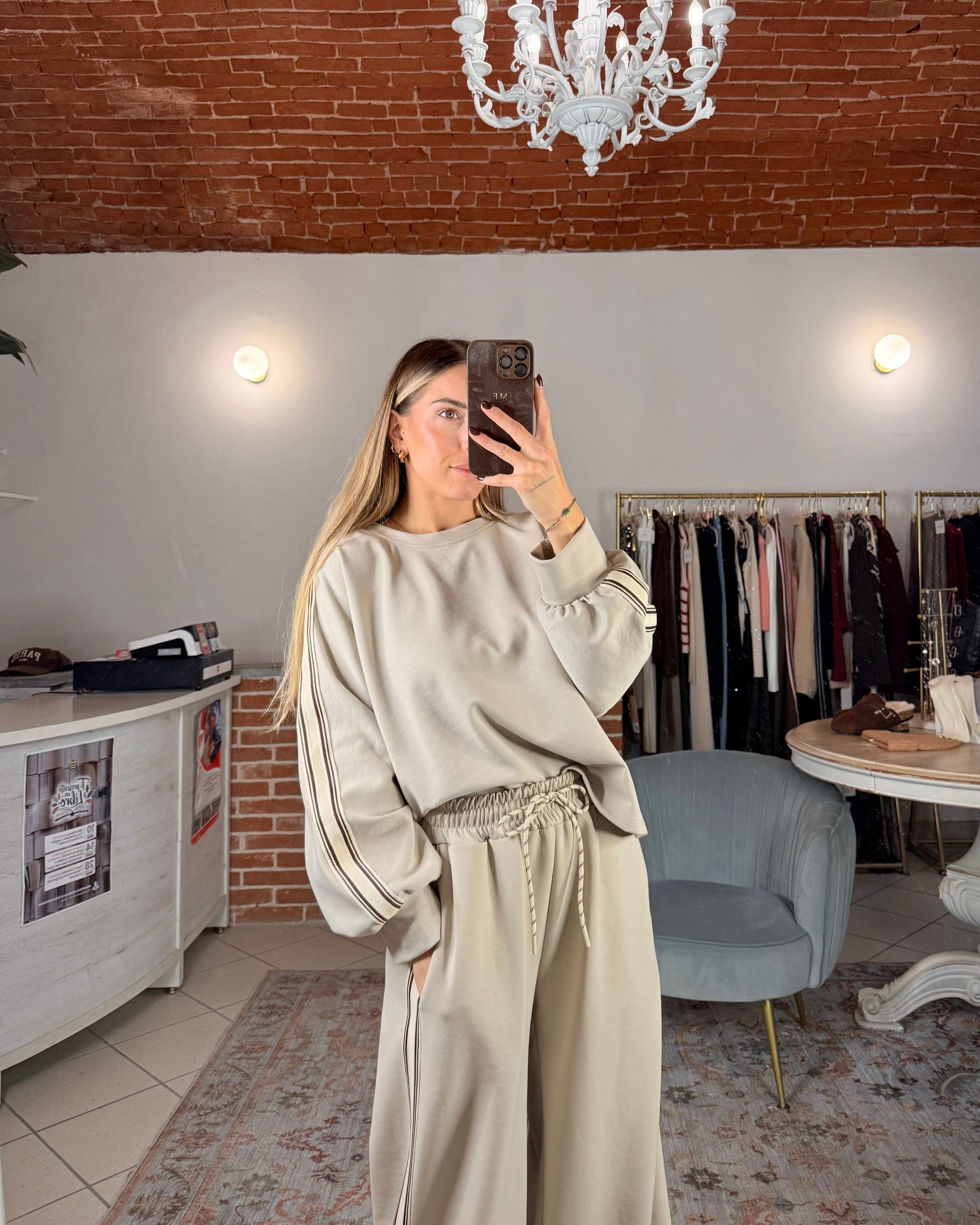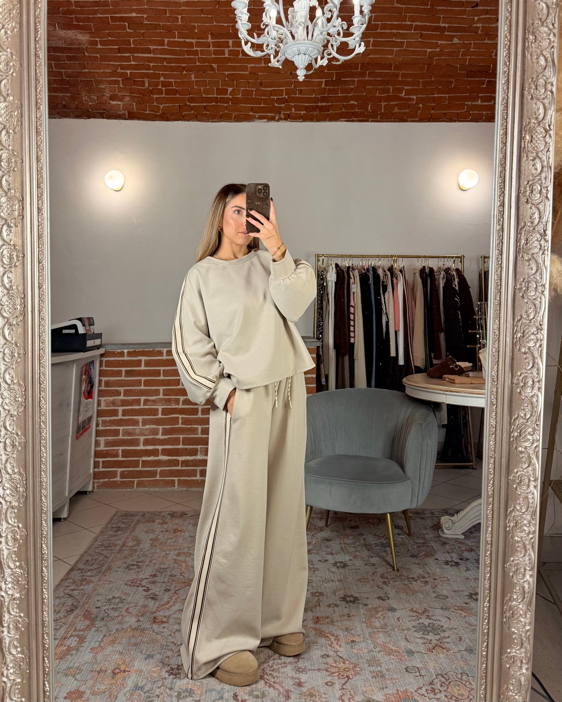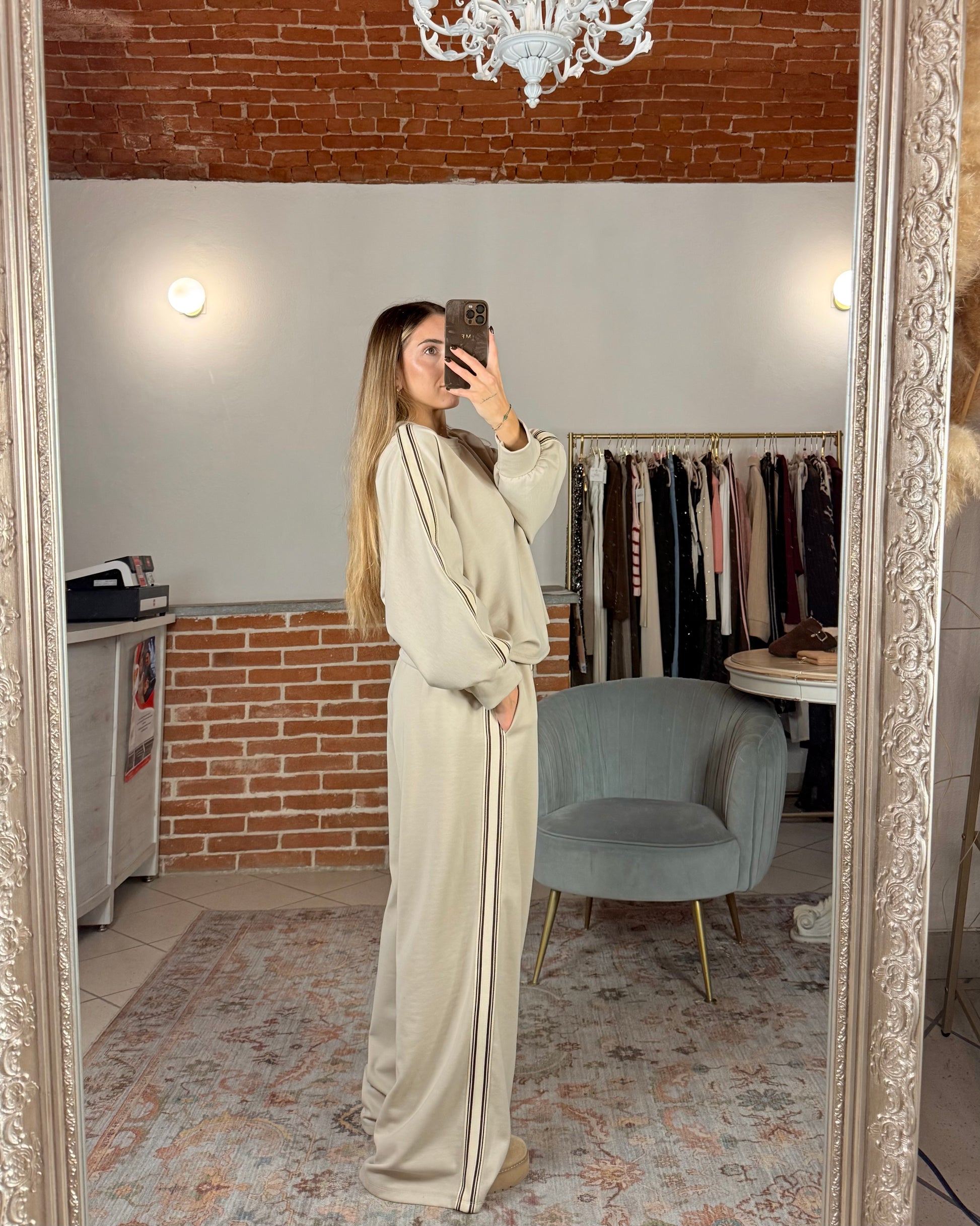 Ensemble de survêtement complet avec sweat-shirt et pantalon en polaire viscose, avec bandes latérales à profils marron foncé.