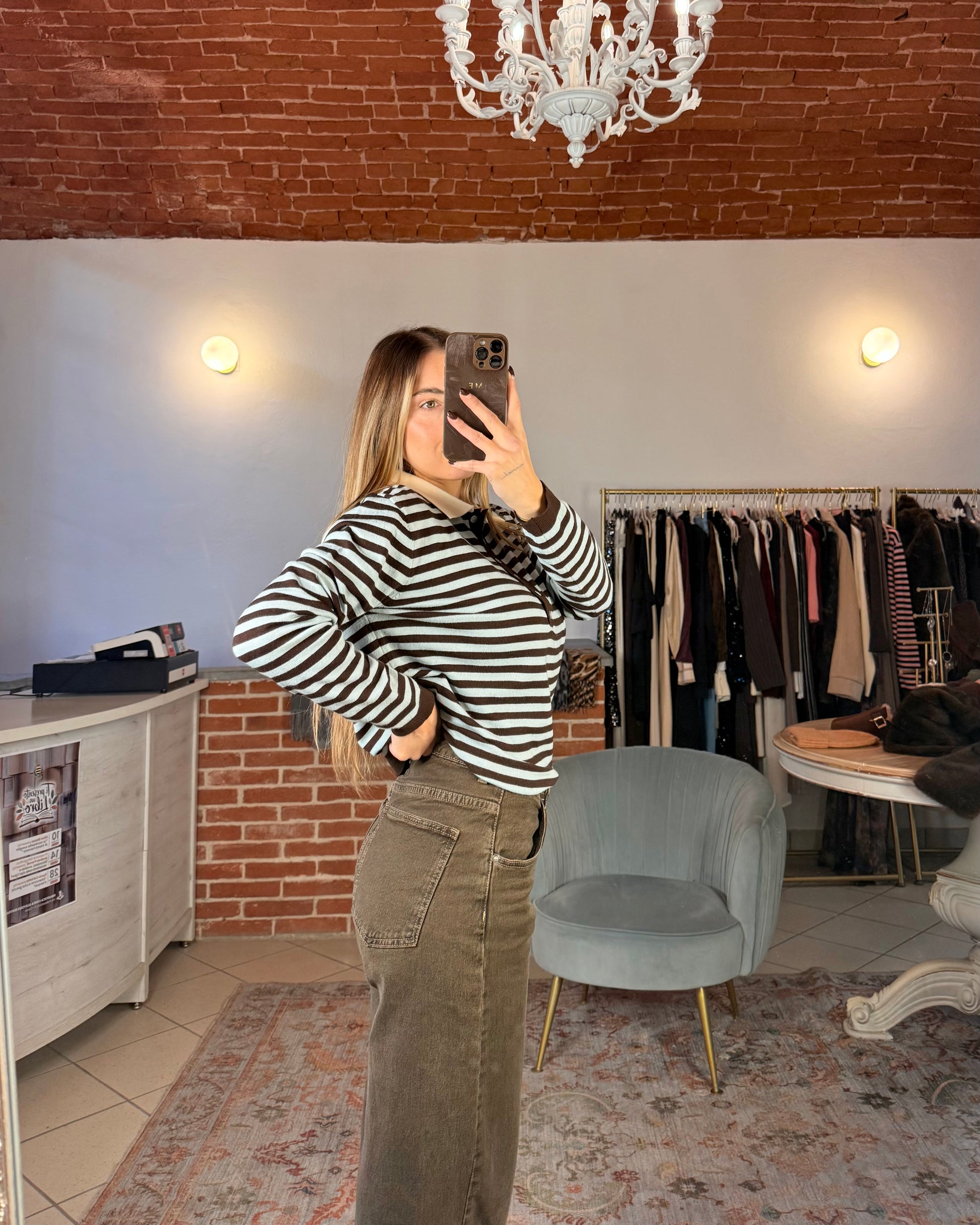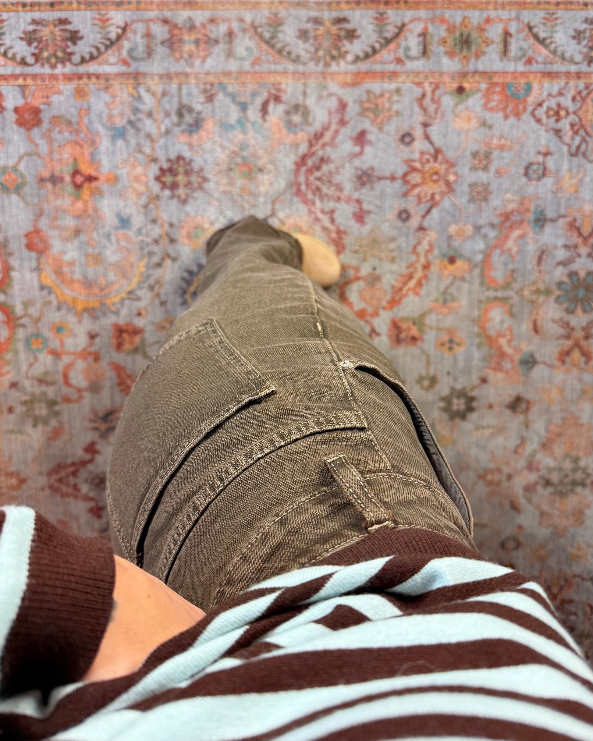 Jeans straight tessuto non elasticizzato color marrone. La ragazza in foto indossa la taglia xs ed è alta 160 cm.