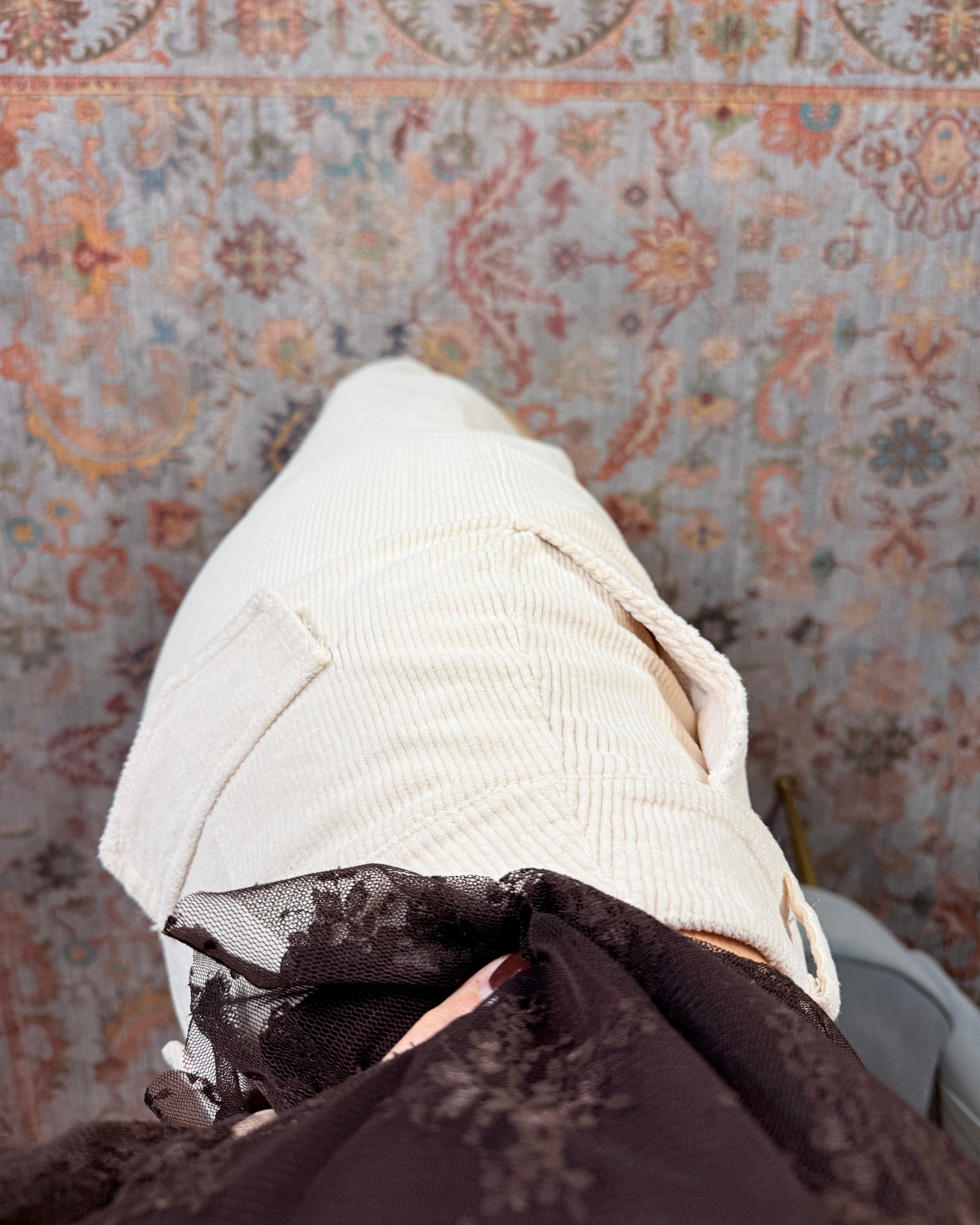 Pantalone in velluto con tasche laterali e taschini decorativi sul retro. La ragazza in foto è alta 160 cm ed è una taglia 40, sta indossando la s.