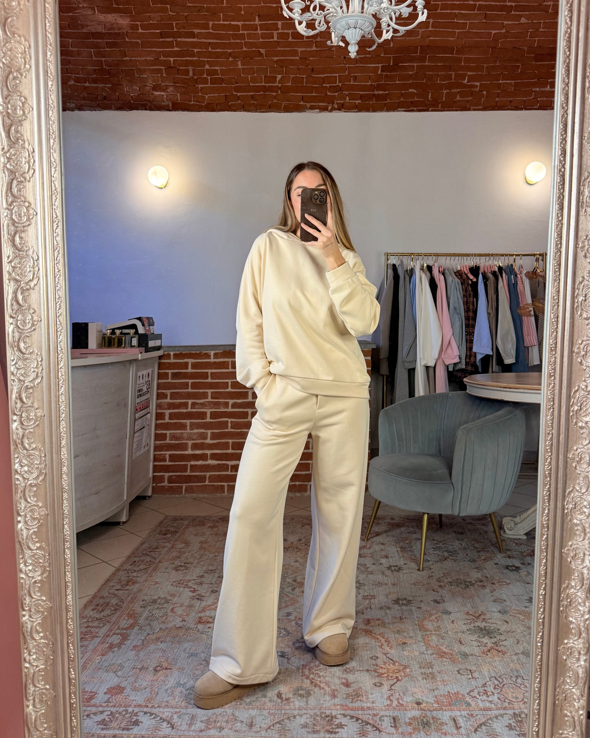Tuta in cotone garzato composta da pantalone a palazzo con tasche ed elastico sul retro e da una felpa over con cappuccio.