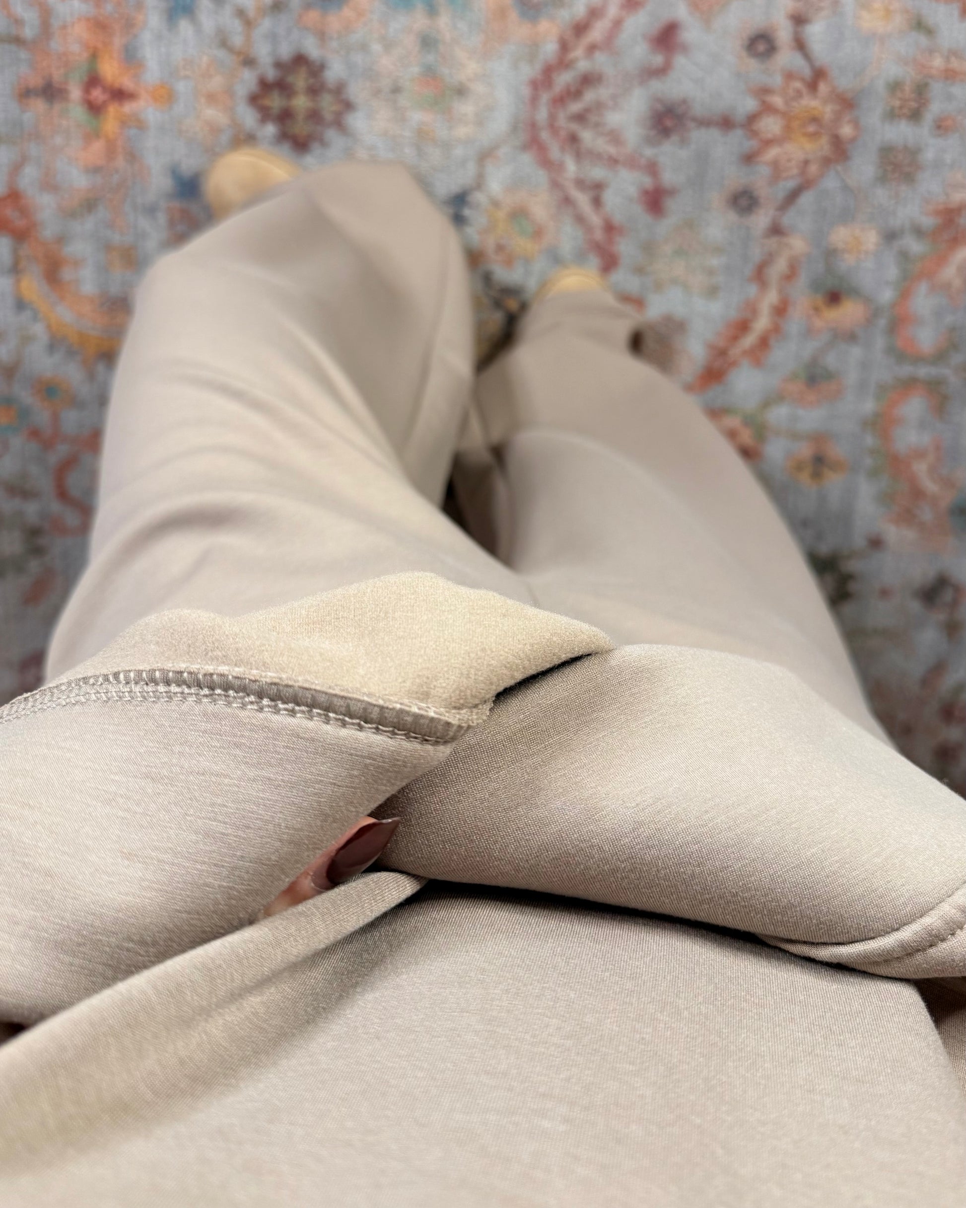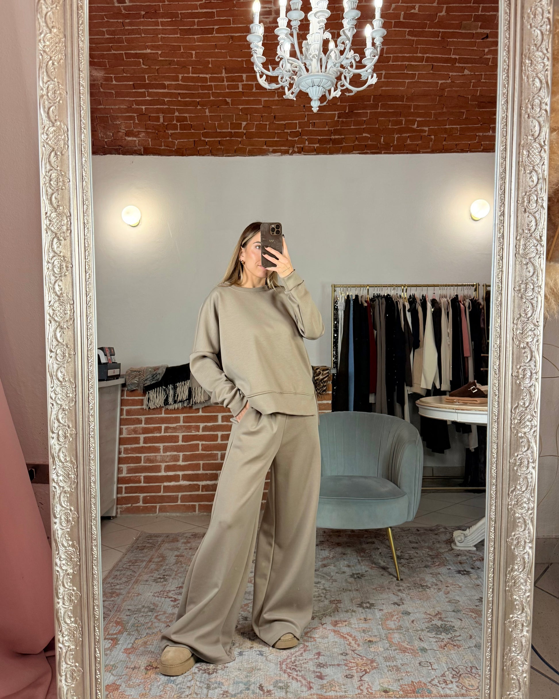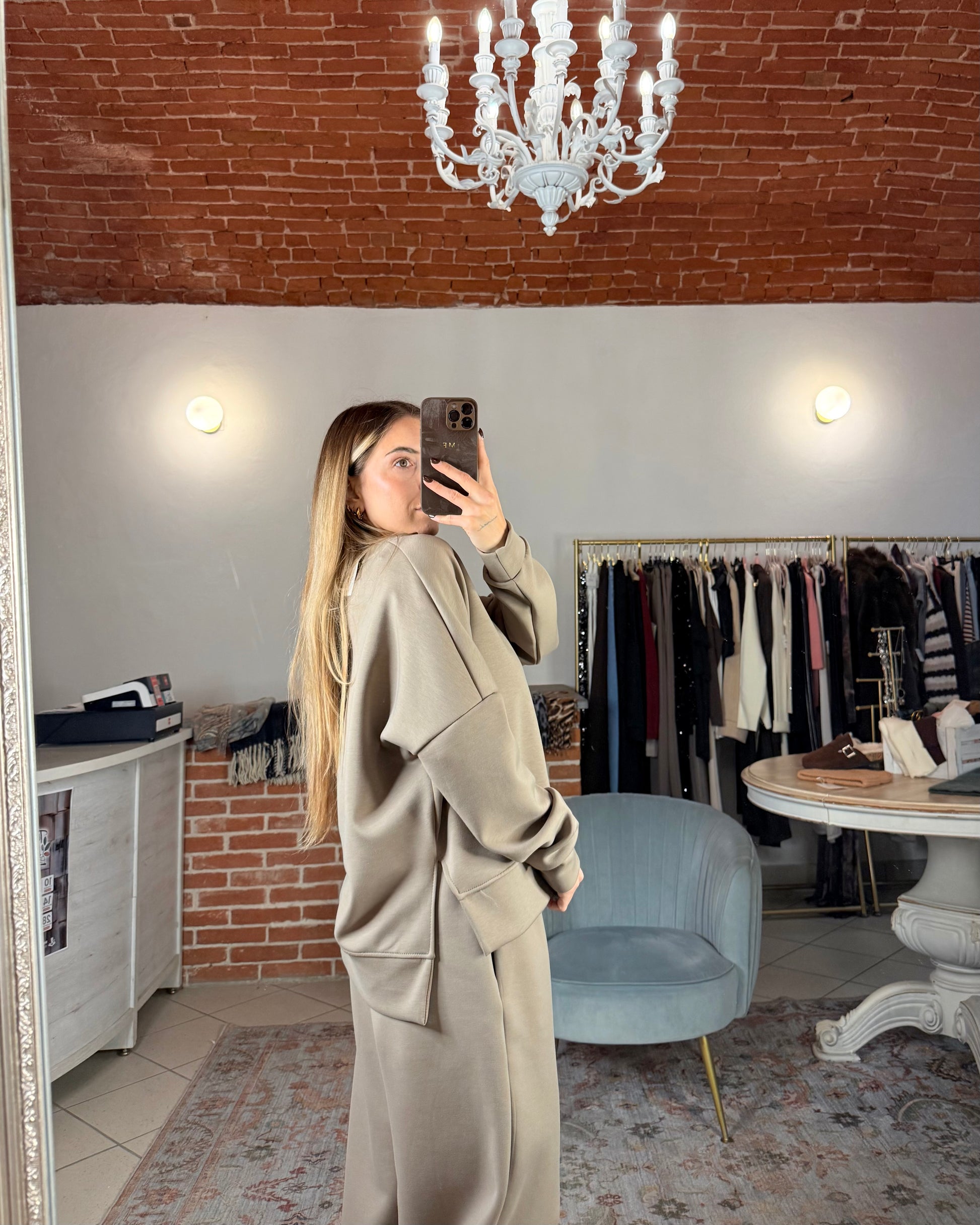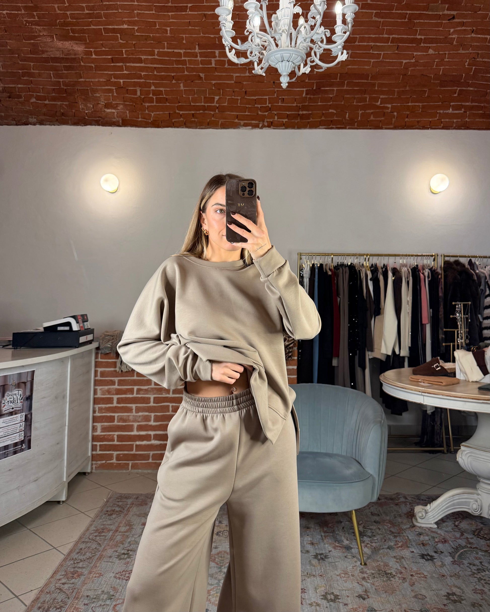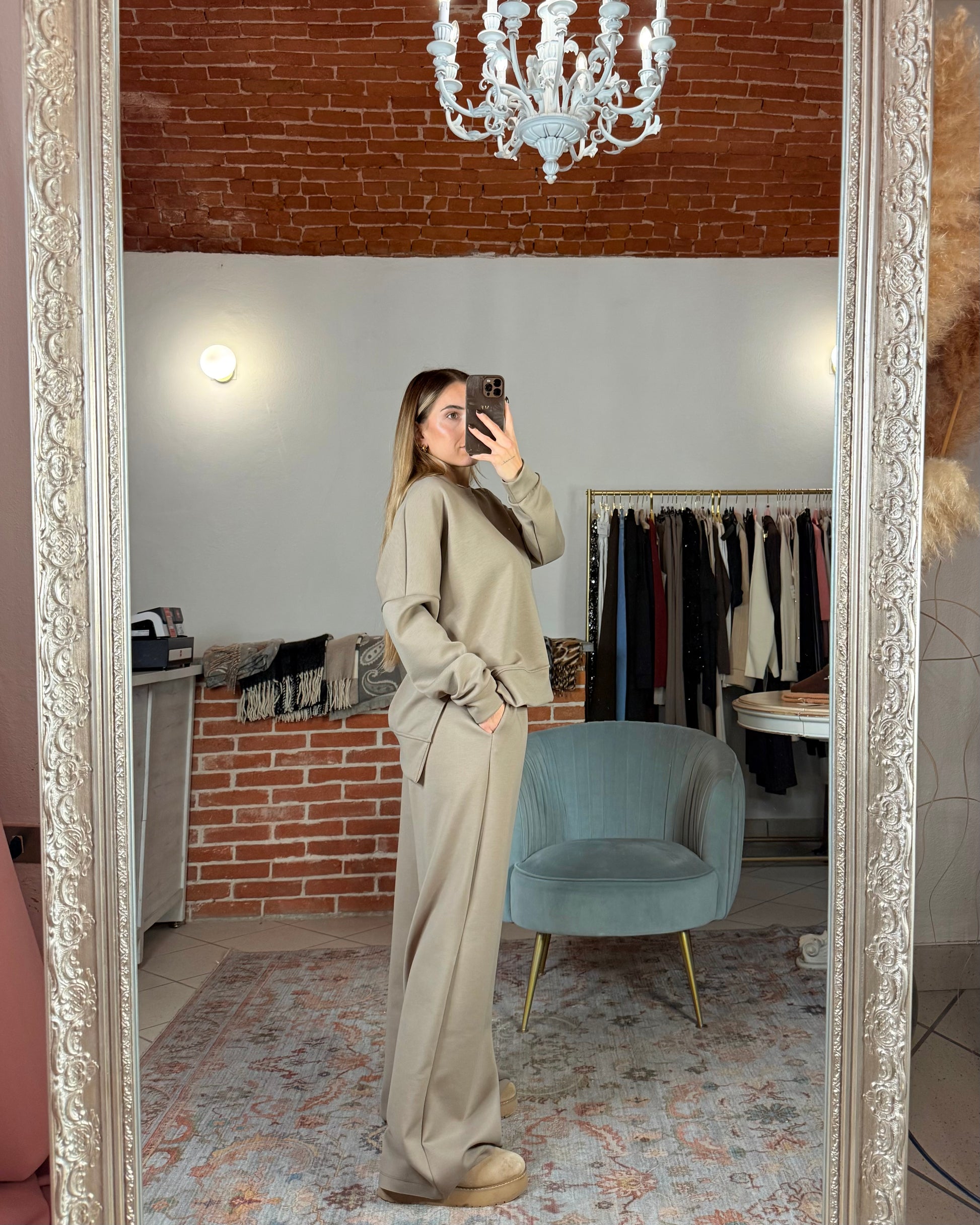Tuta composta da una felpa oversize con spacchi laterali, più lunga sul retro e da un pantalone a palazzo con tasche laterali ed elastico in vita.