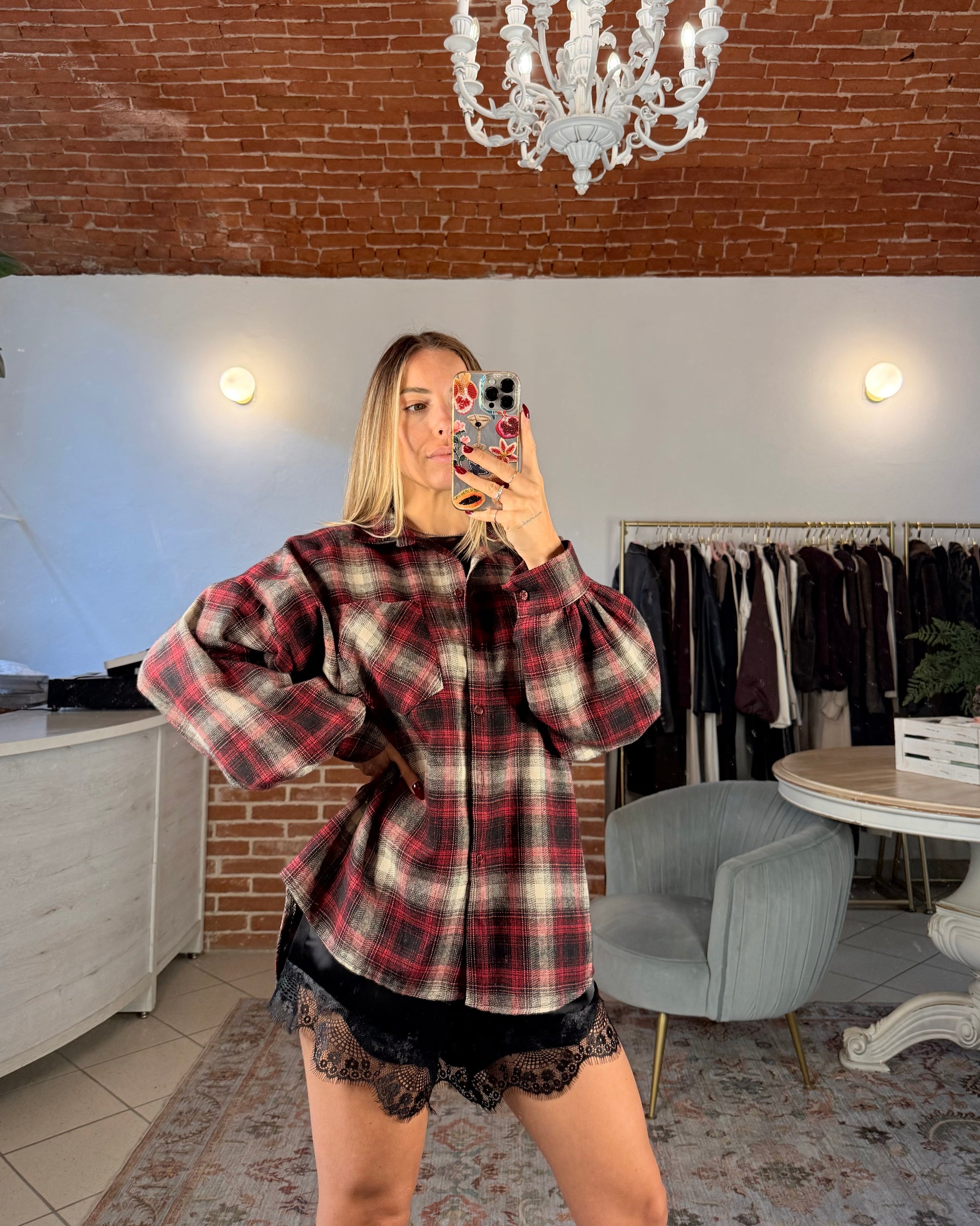 Camicia oversize in cotone flanella con maniche a palloncino.