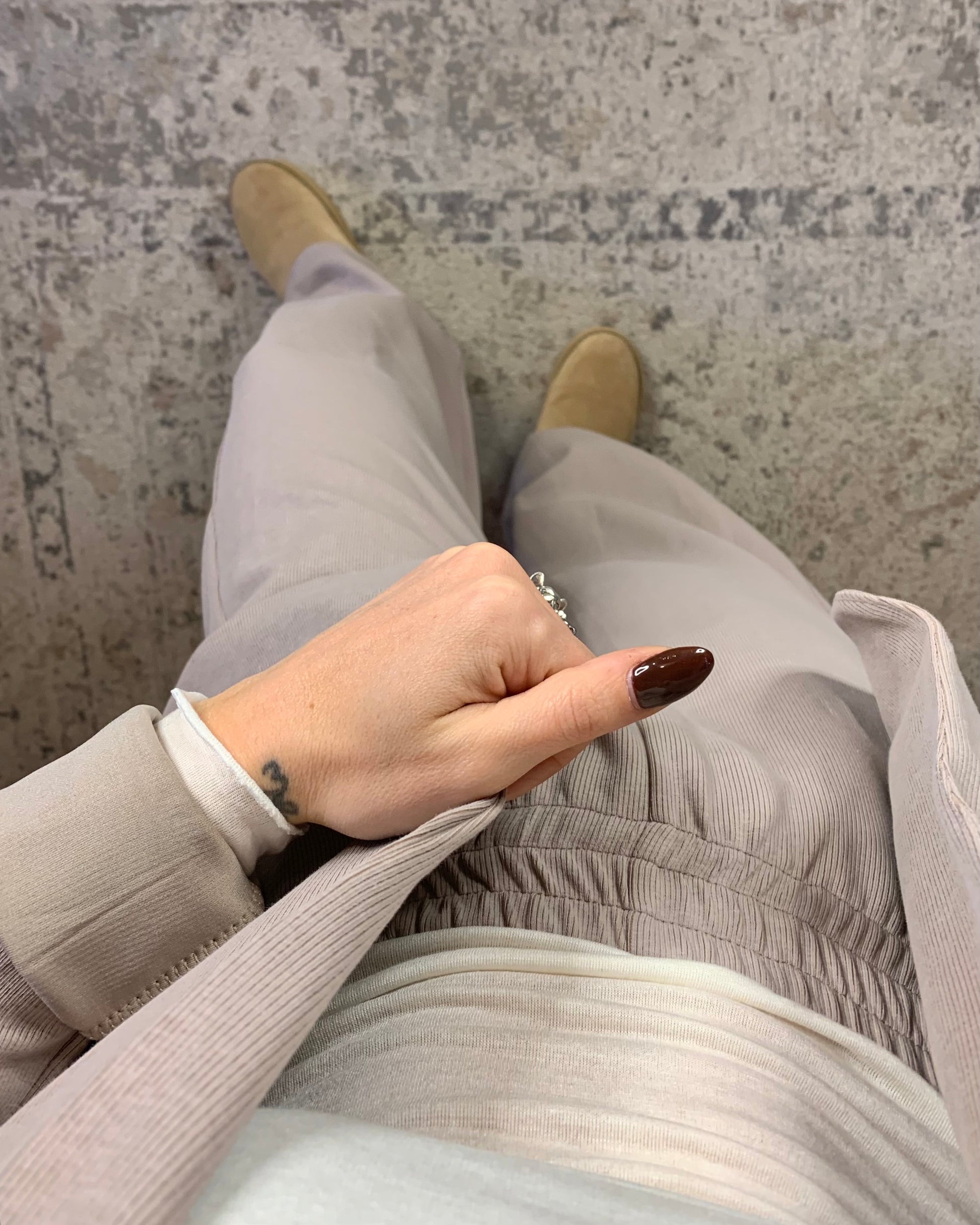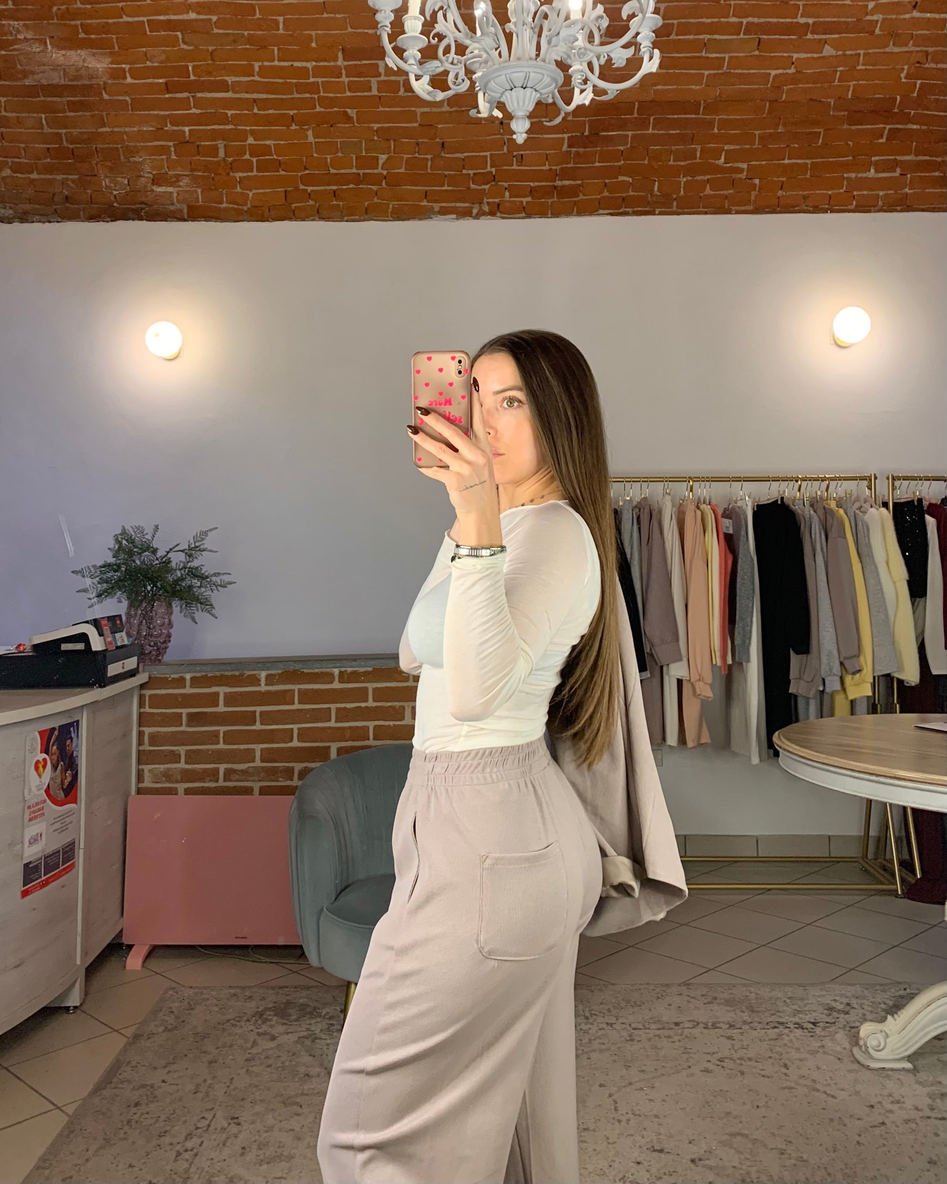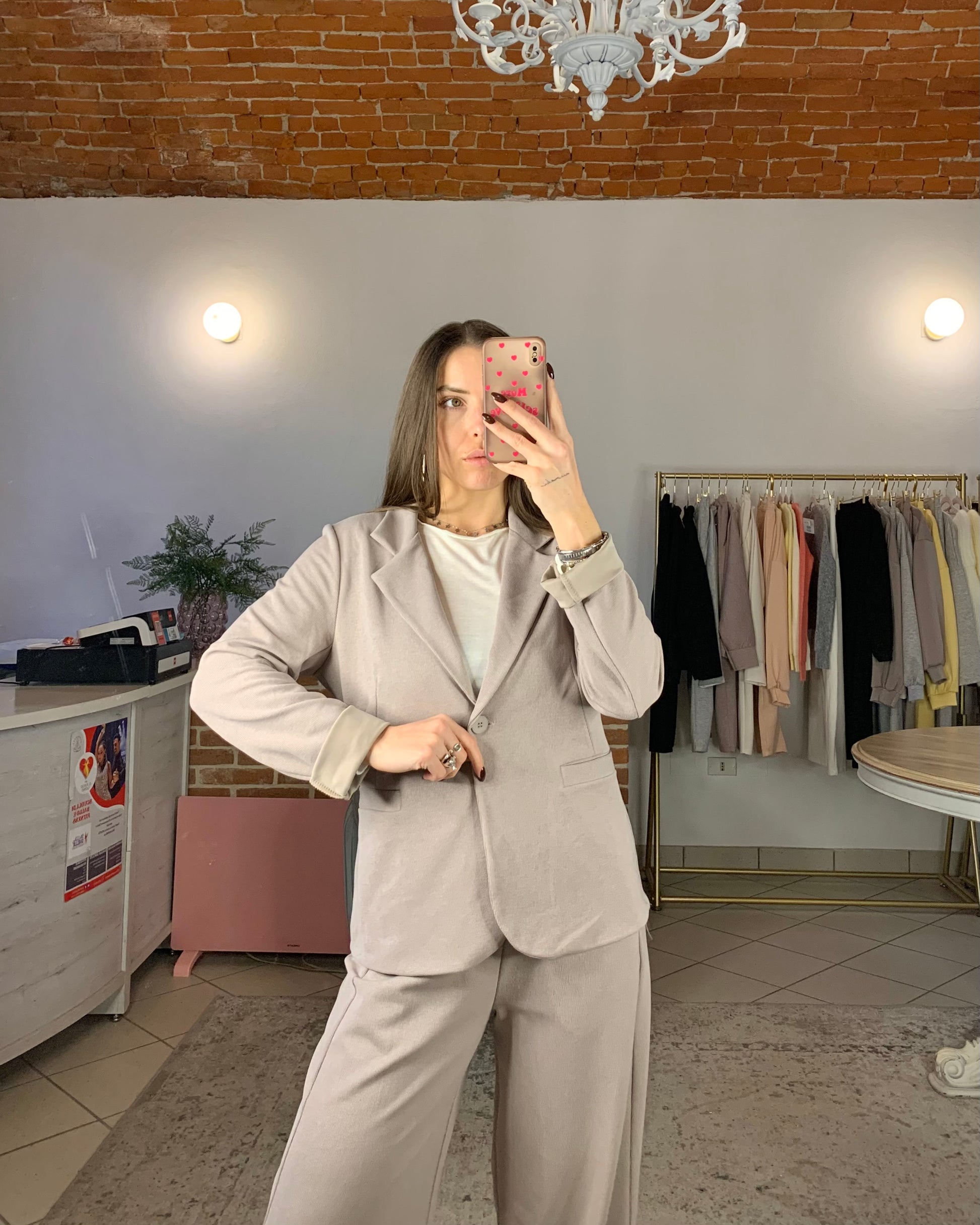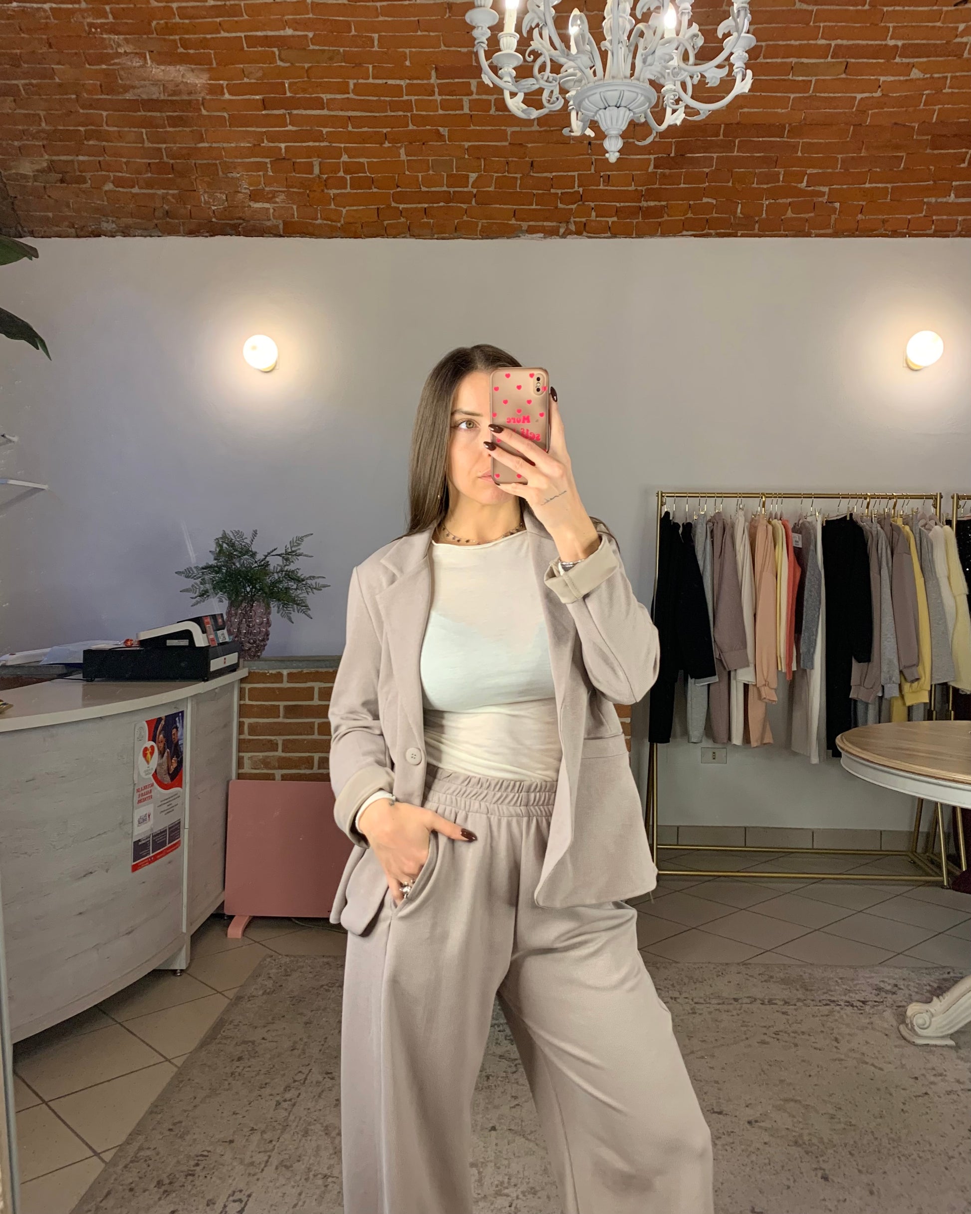 Coordinato composto da un blazer sfoderato ed un pantalone modello bagghy, entrambi a costine in misto cotone.
