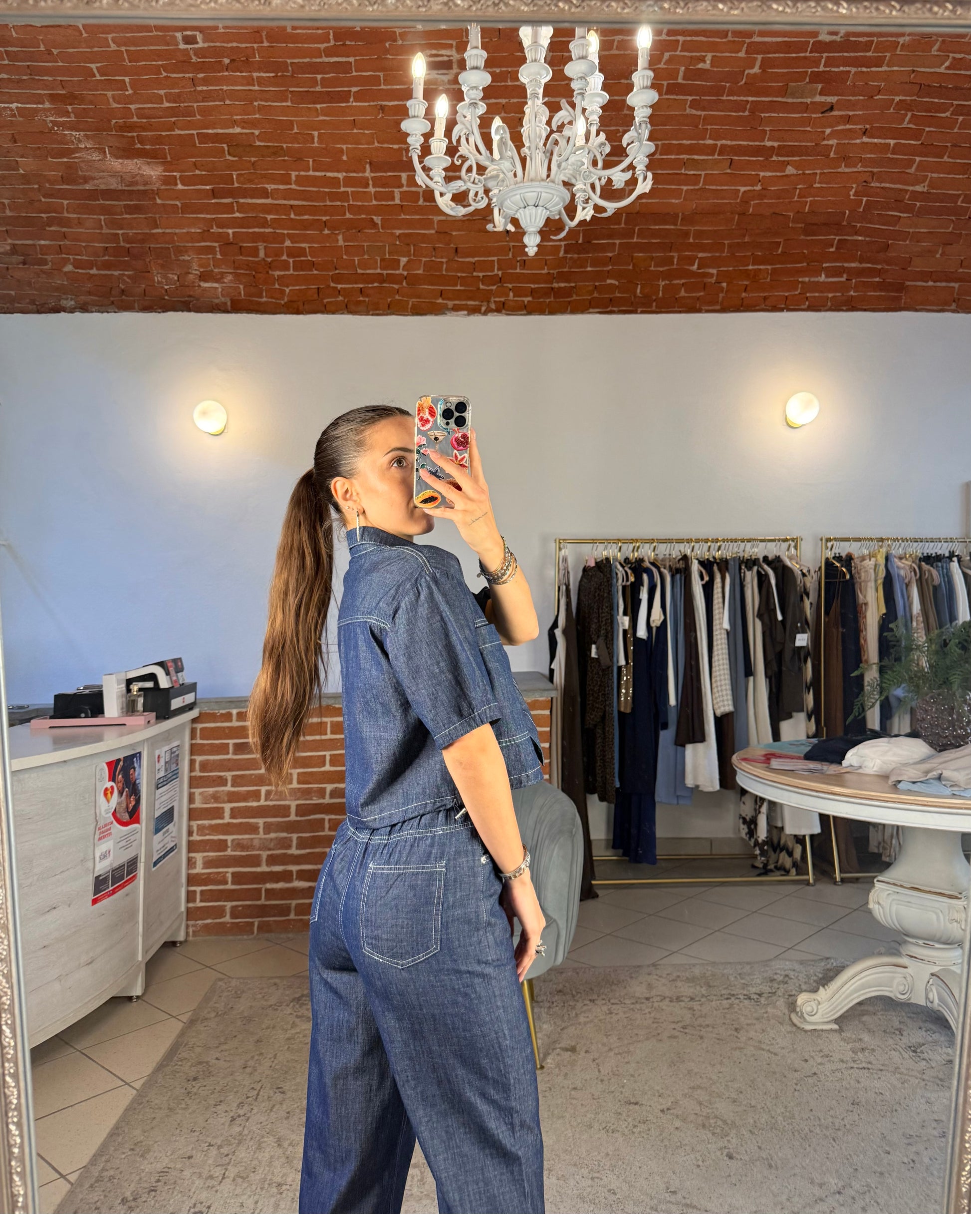 Coordinato in denim leggero composto da un pantalone a vita alta ed una giacchetta crop con coulisse in vita. S/M