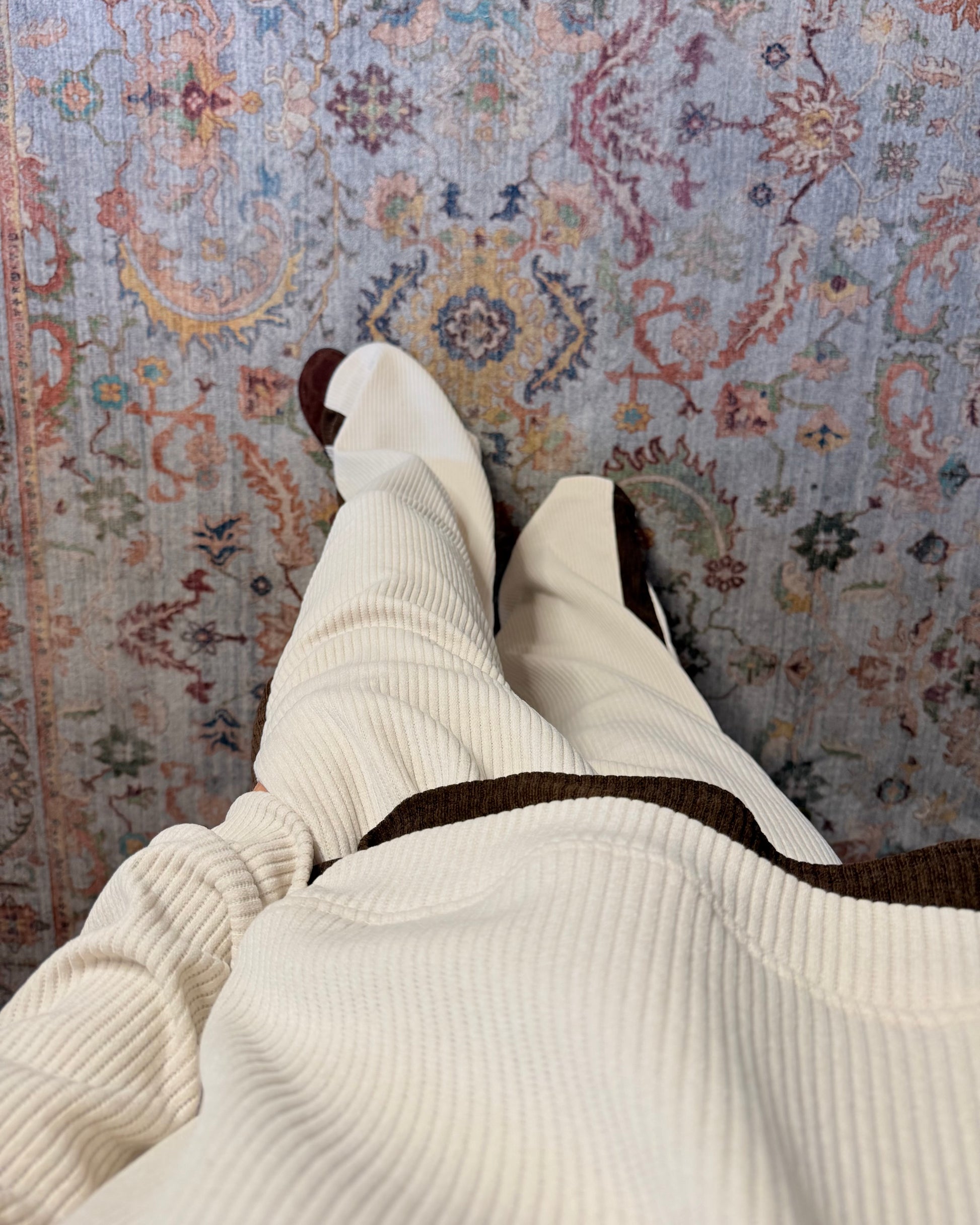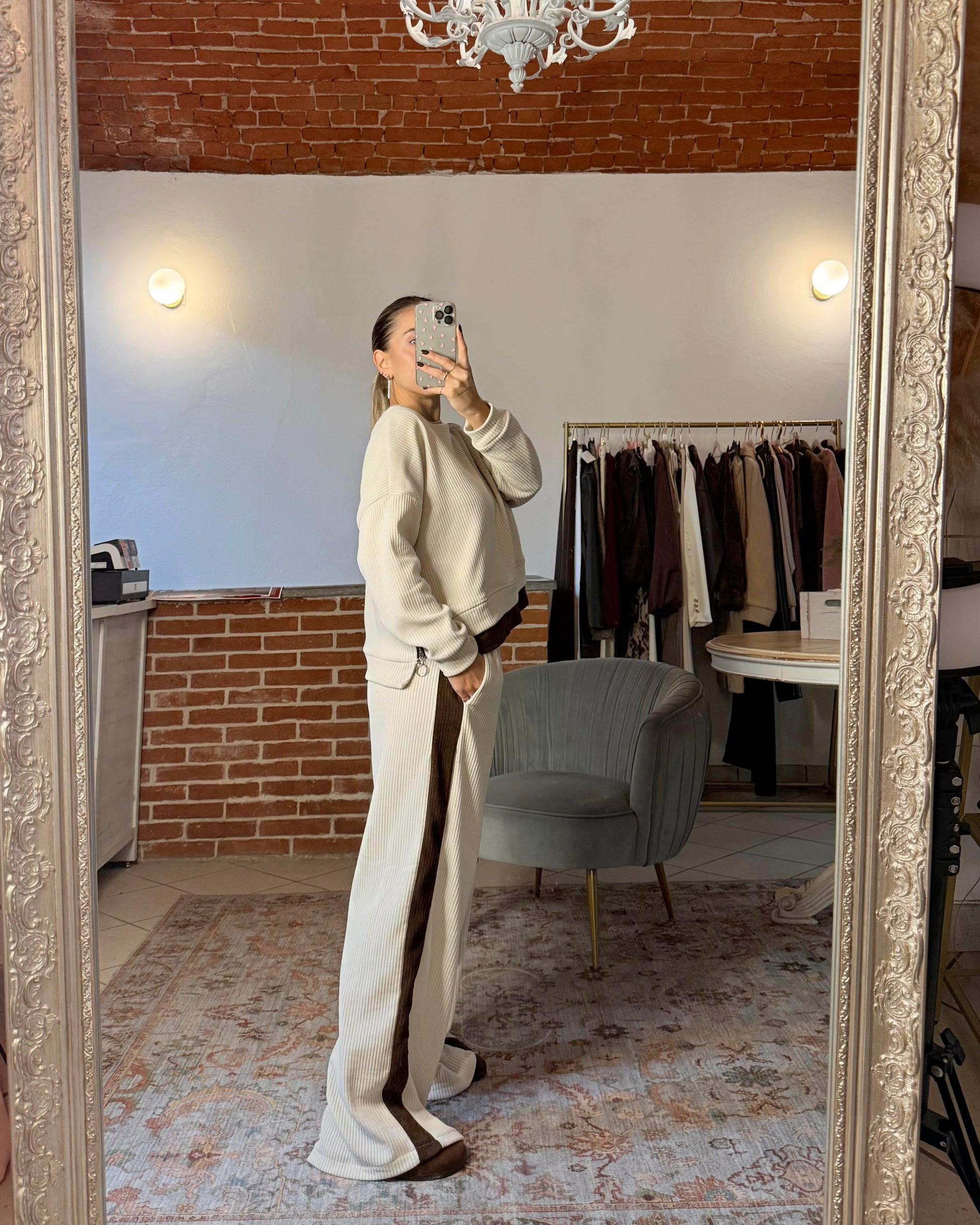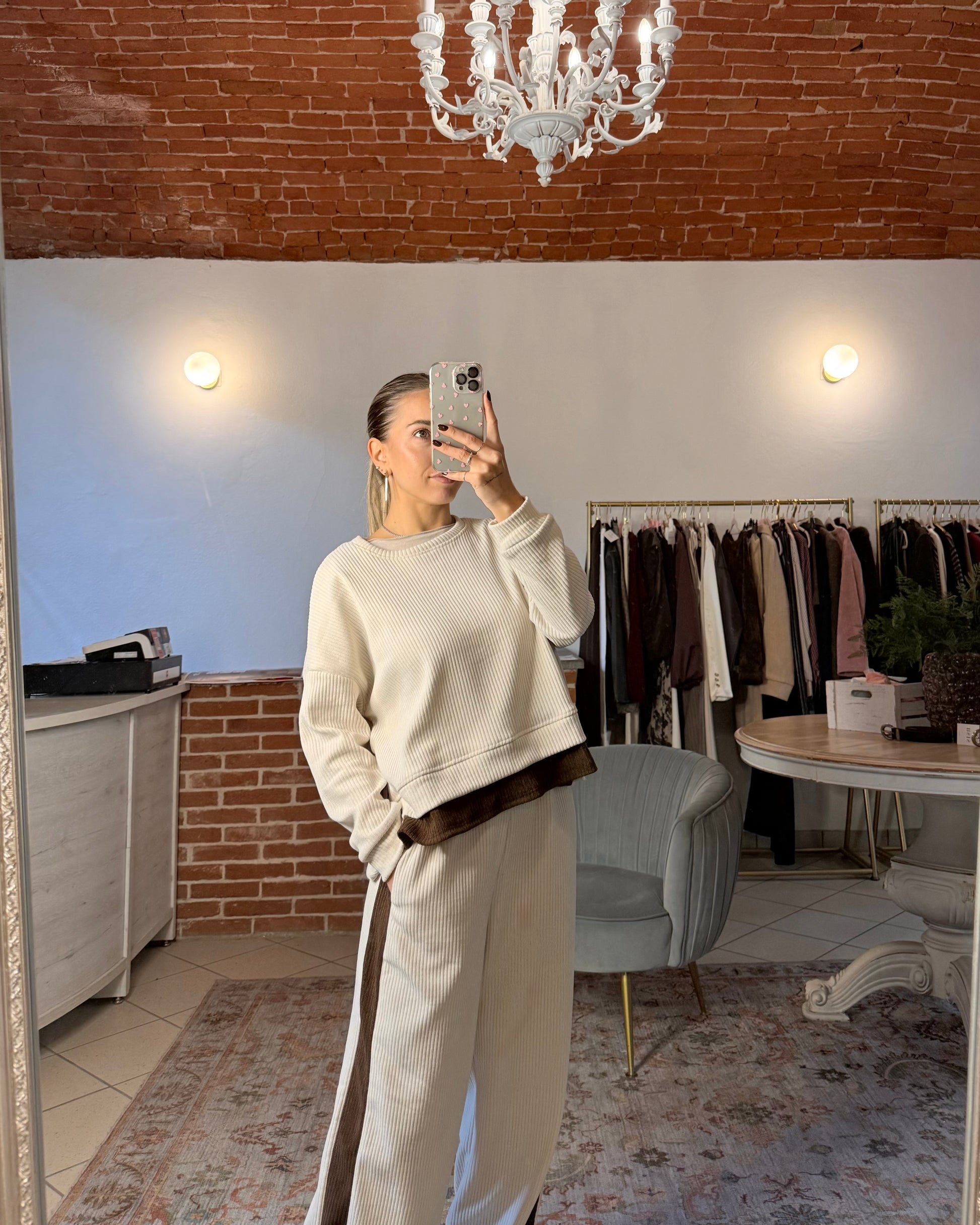 Completo felpa e pantalone in velluto con bande laterali a contrasto. Il completo è taglia unica e veste fino ad una L.
