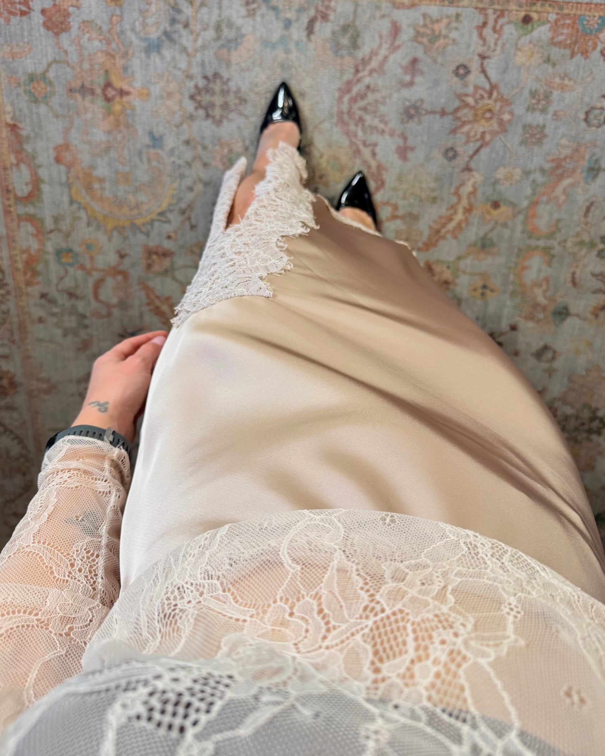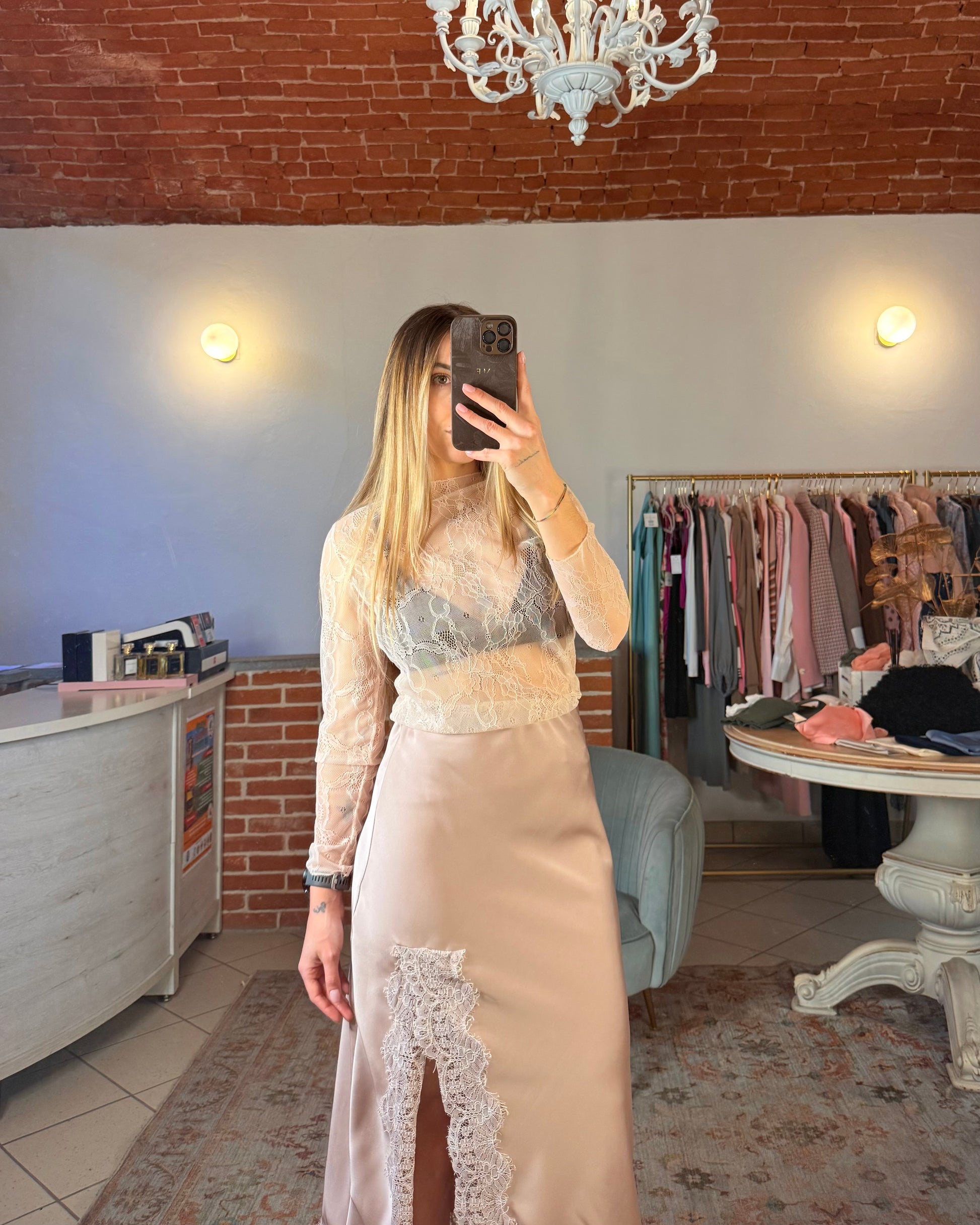 Longuette in raso con spacco e pizzo.
