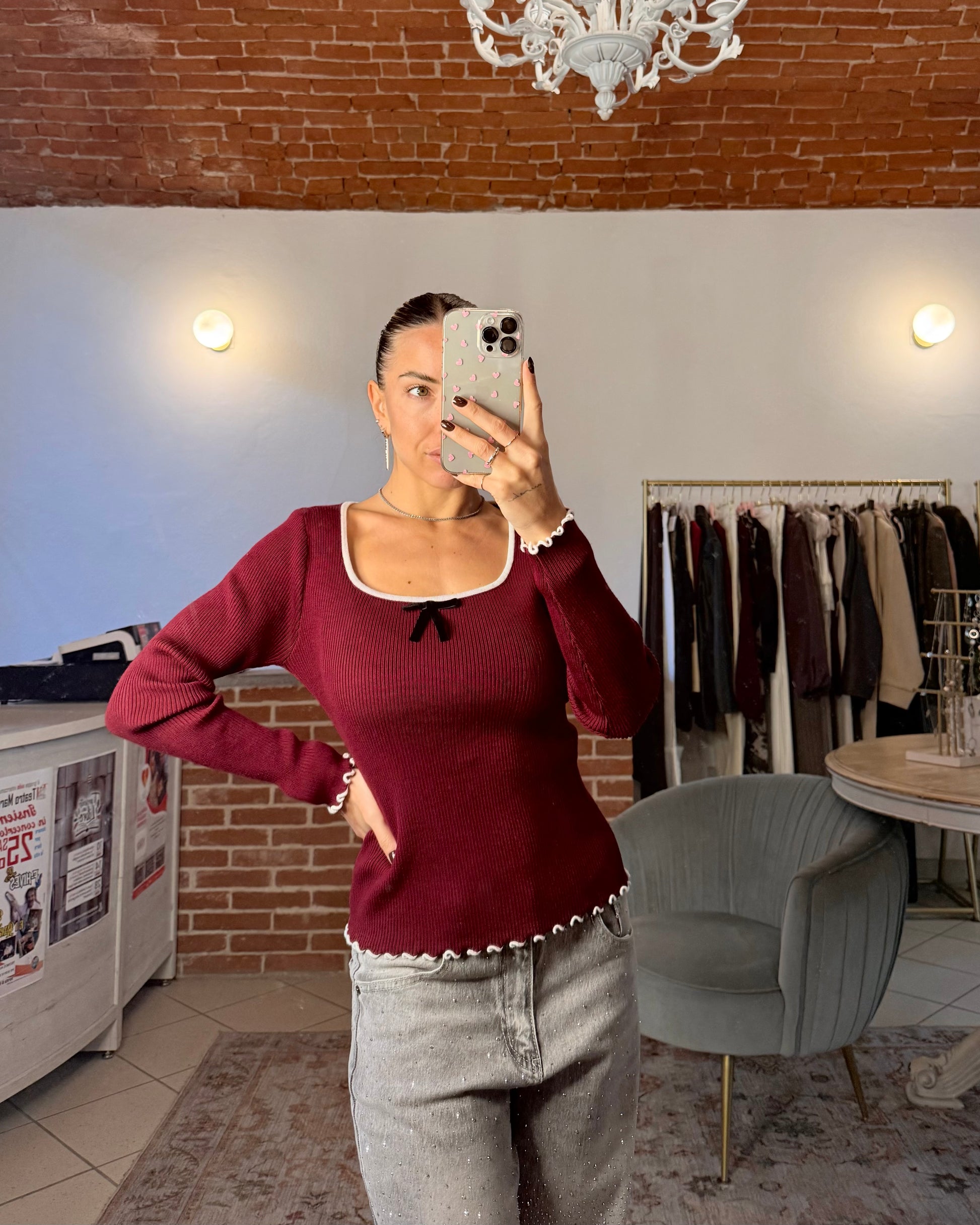 Maglioncino a costine in viscosa con profili arricciati a contrasto, scollo quadrato con fiocchetto in velluto.