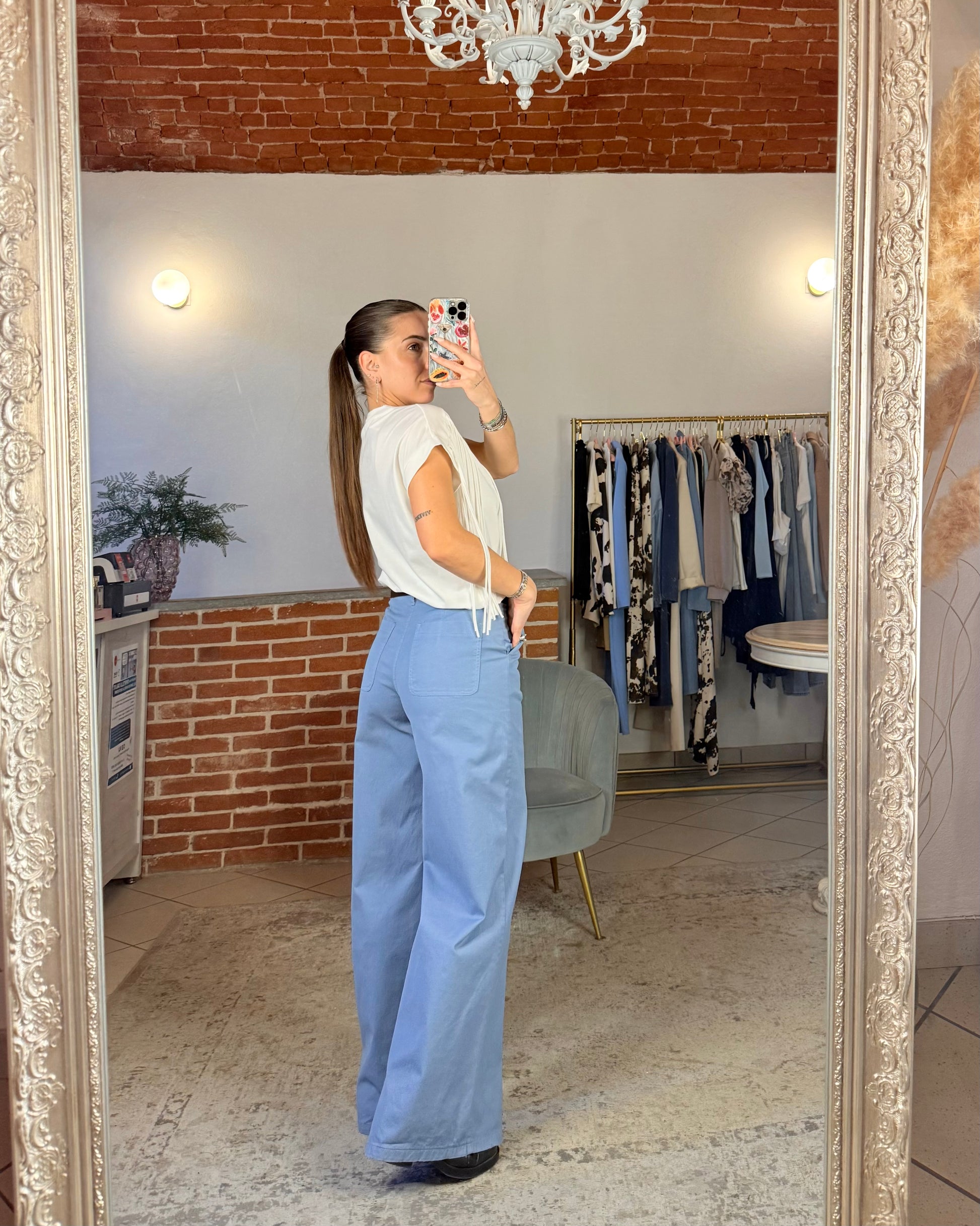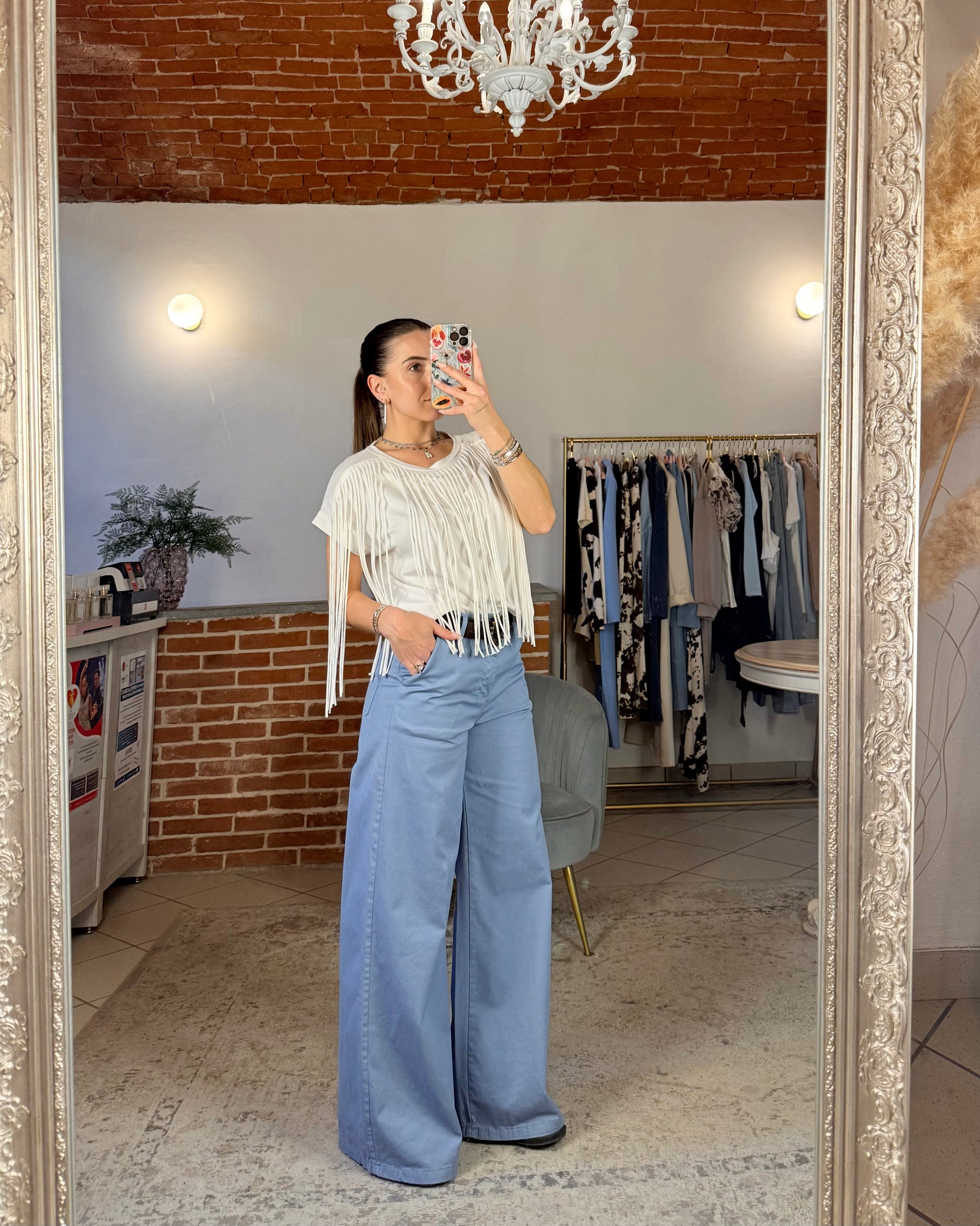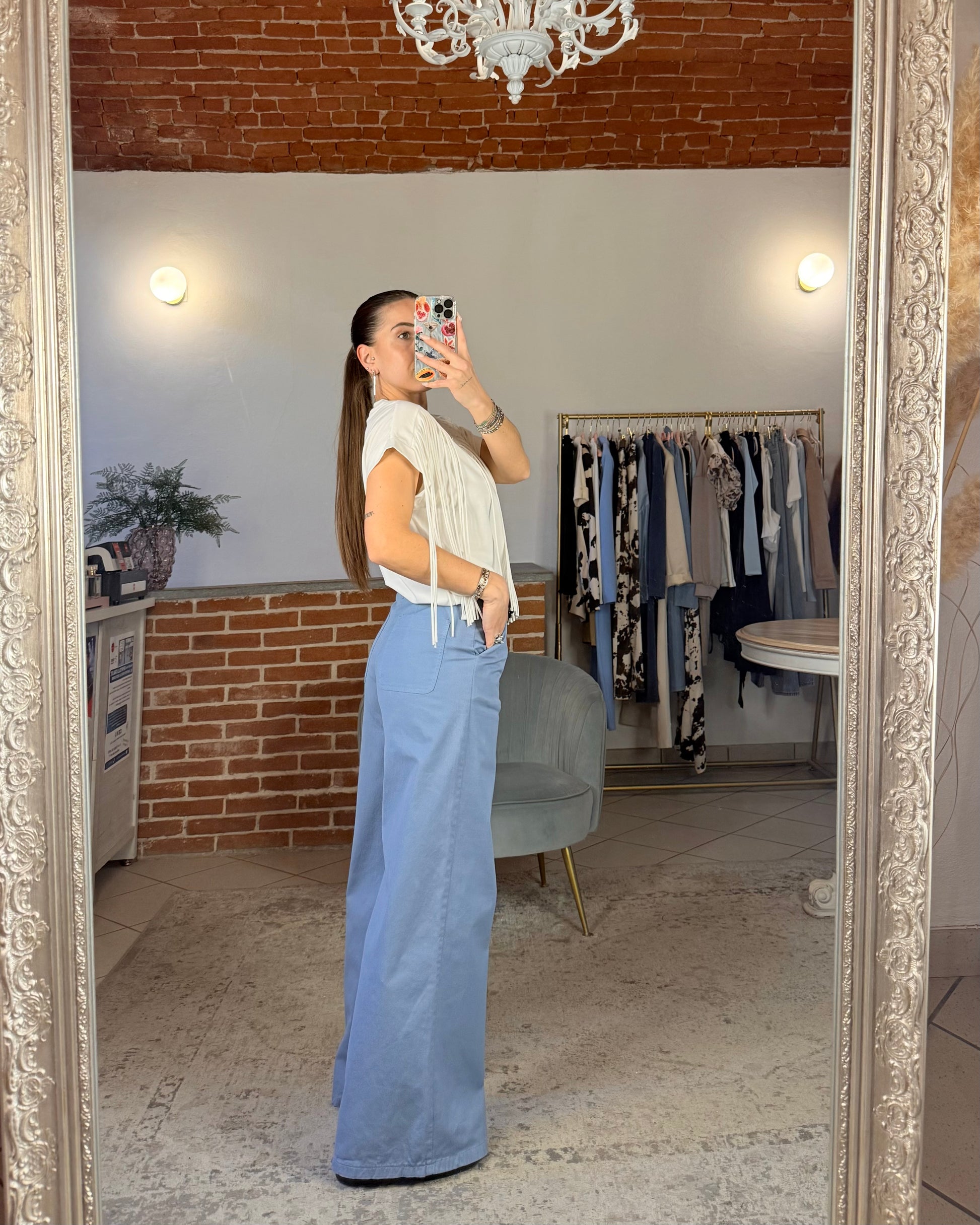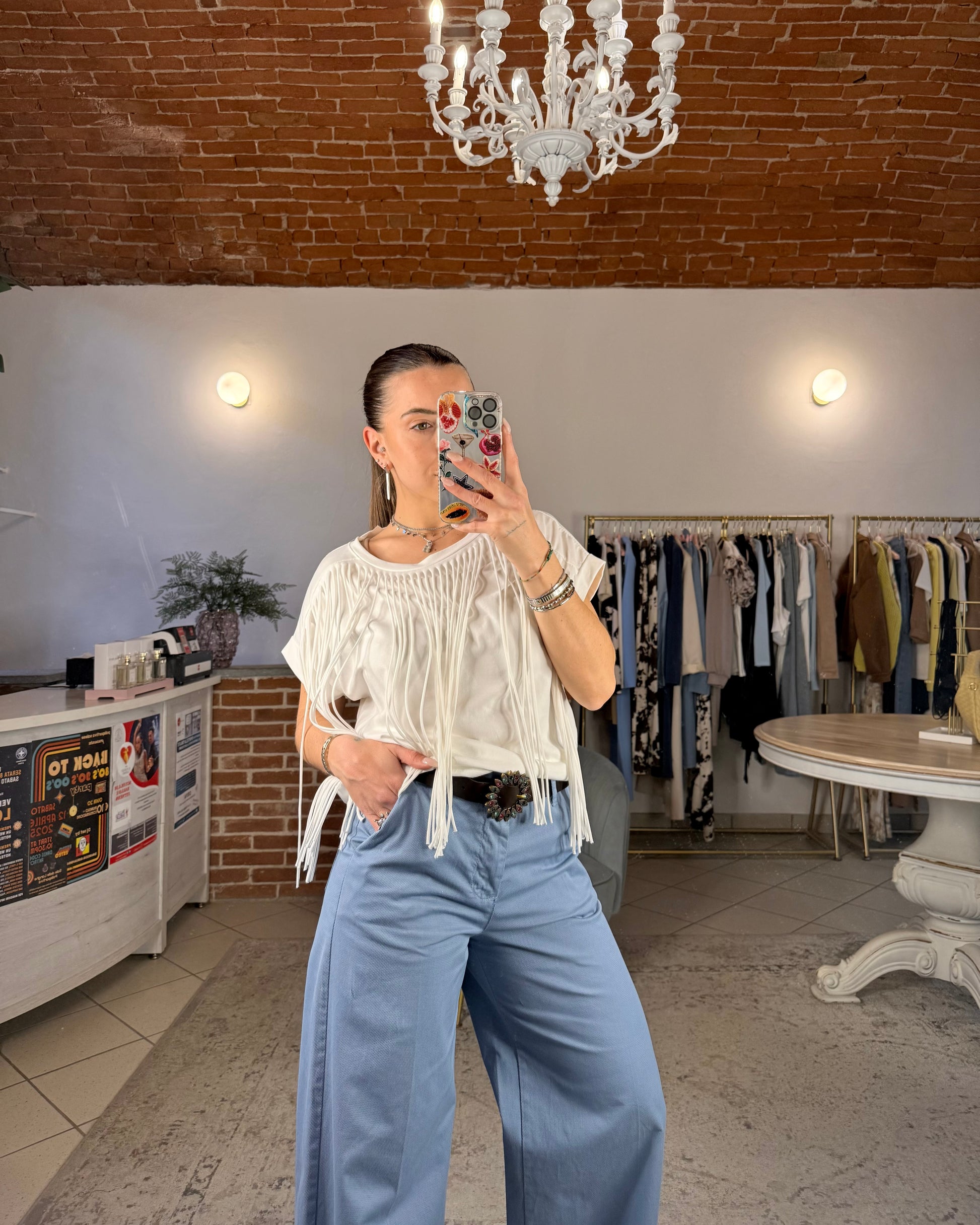 Pantalone modello wide leg in cotone elasticizzato con trama, con tasche laterali e posteriori.
