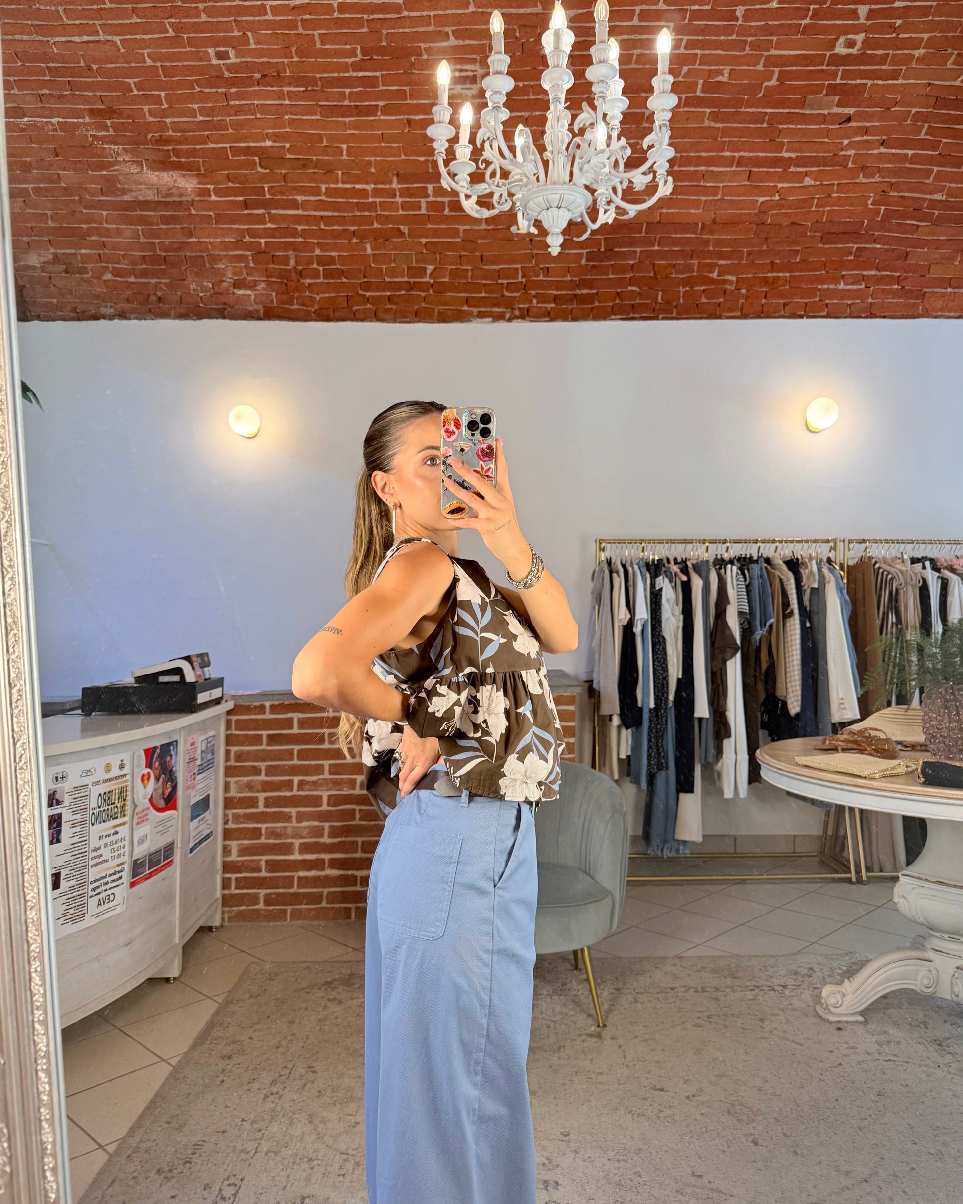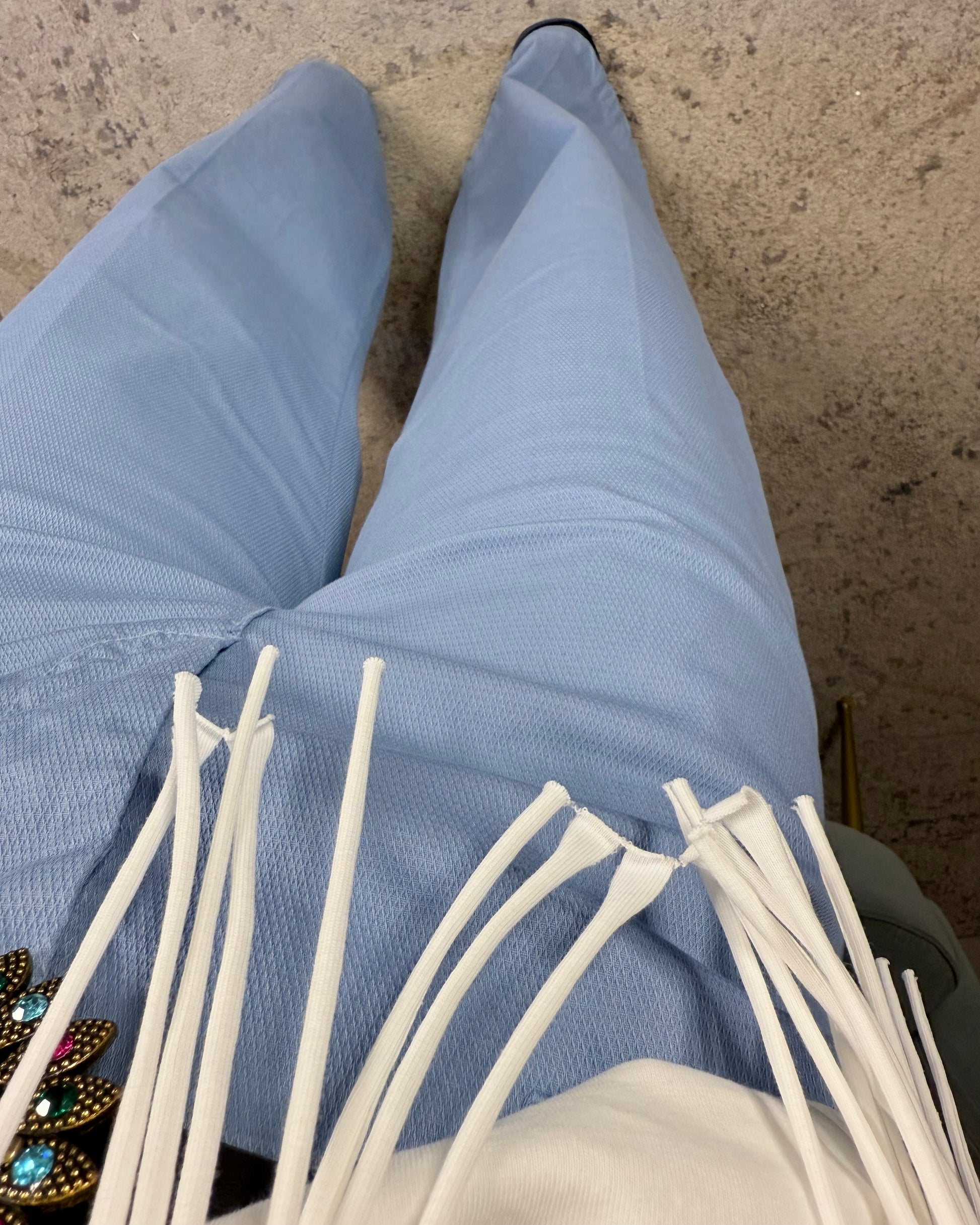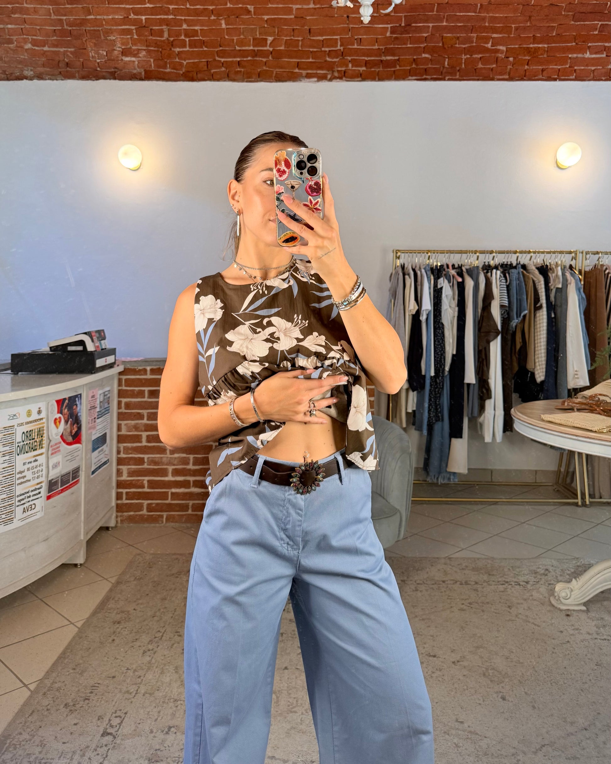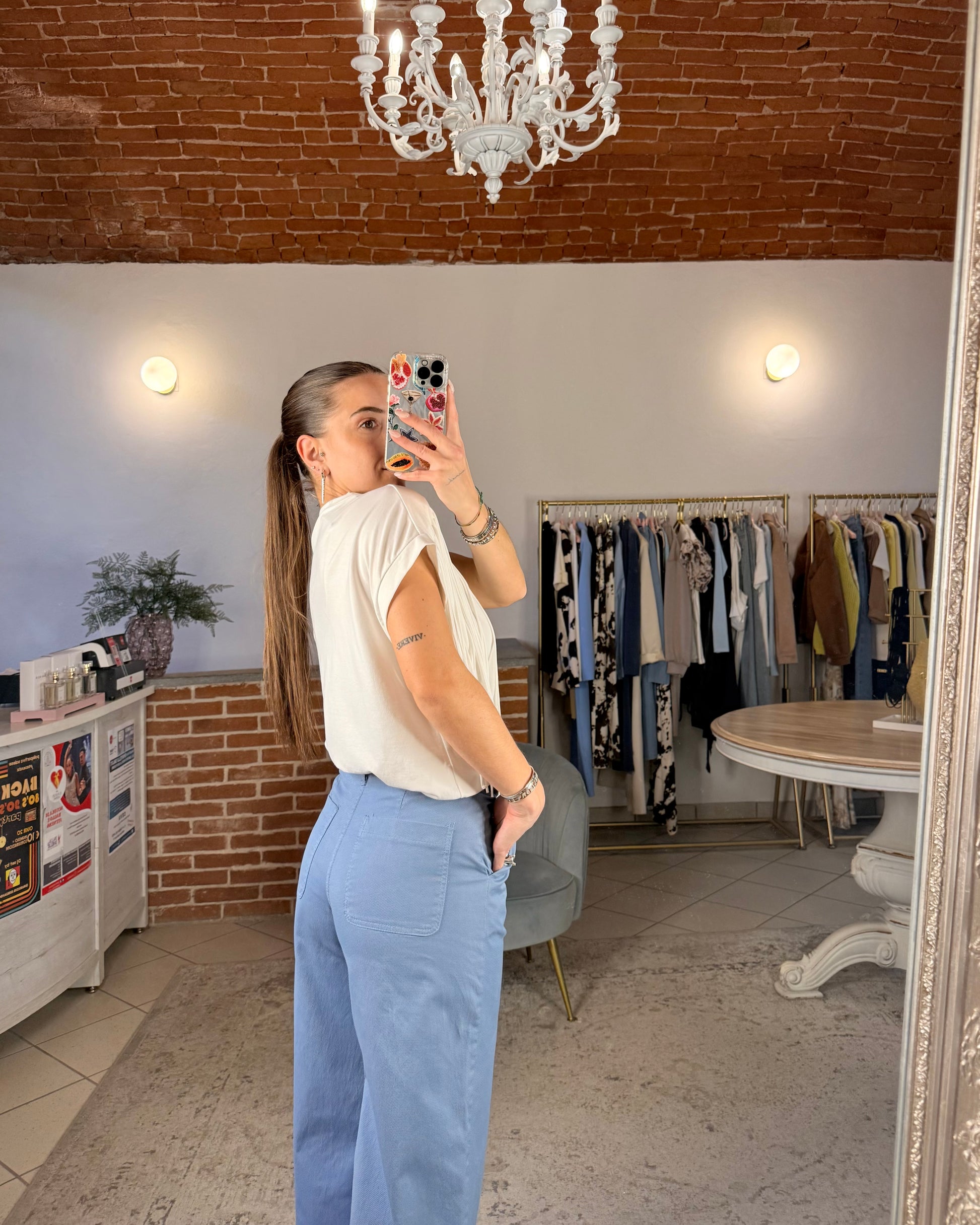 Pantalone modello wide leg in cotone elasticizzato con trama, con tasche laterali e posteriori.