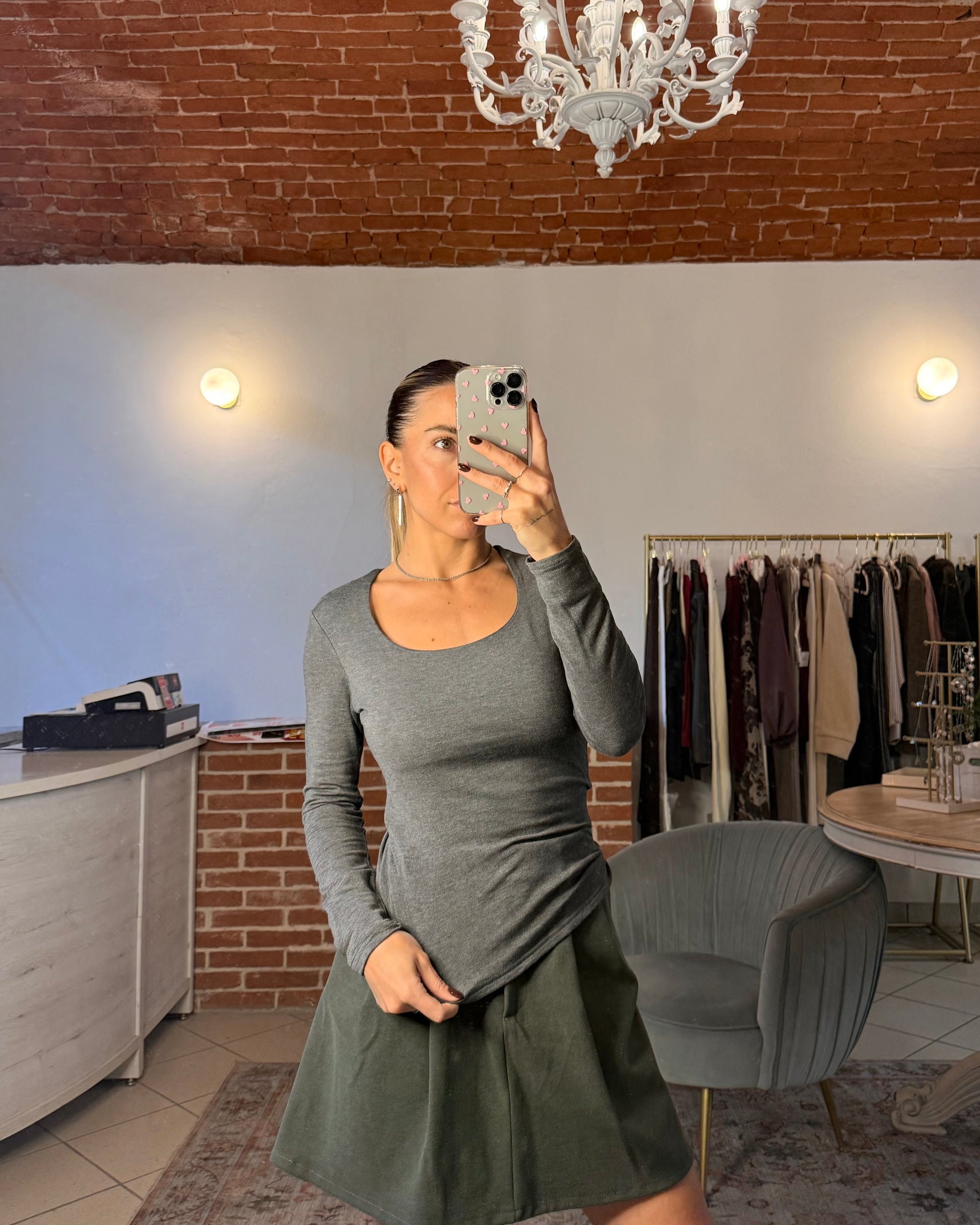 Maglietta in viscosa scollo tondo con maniche lunghe felpata all’interno.