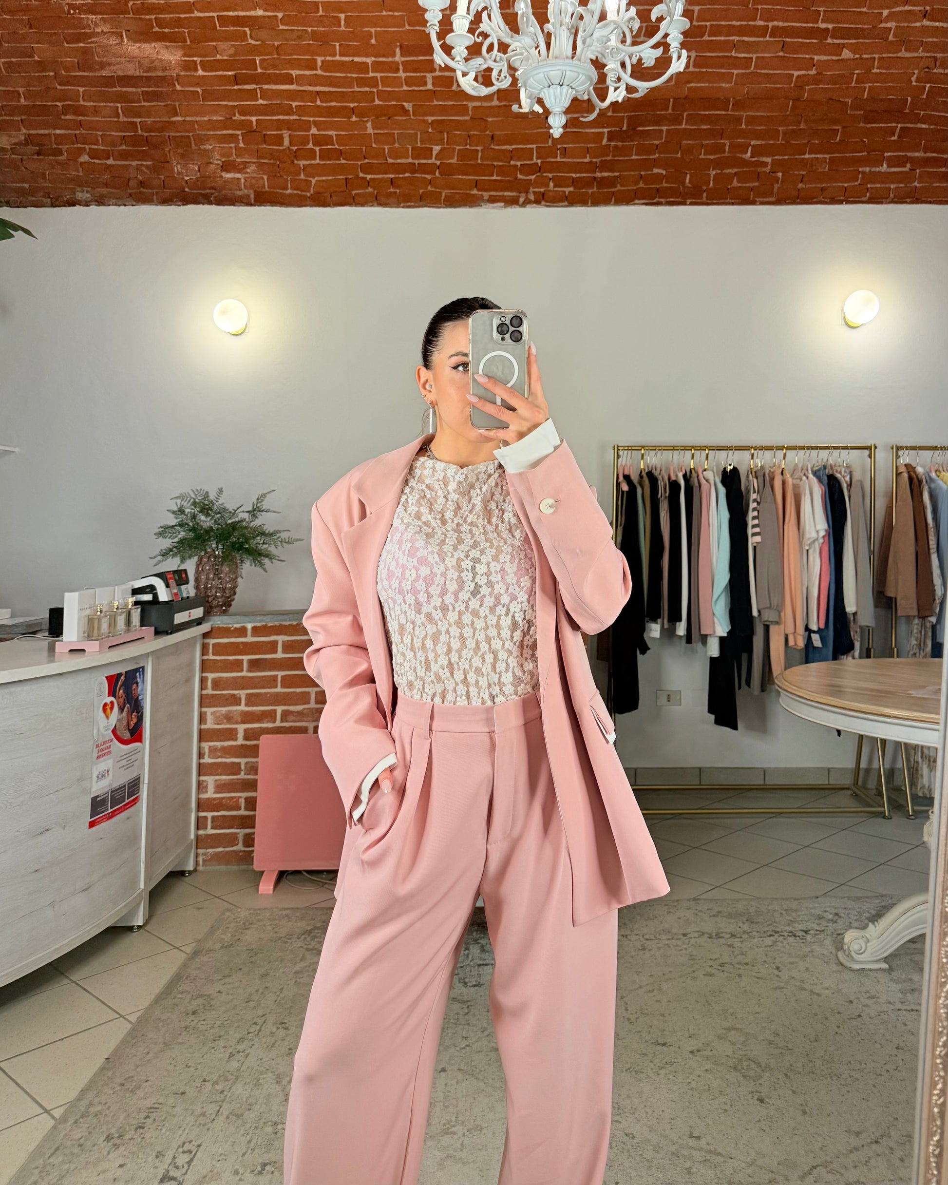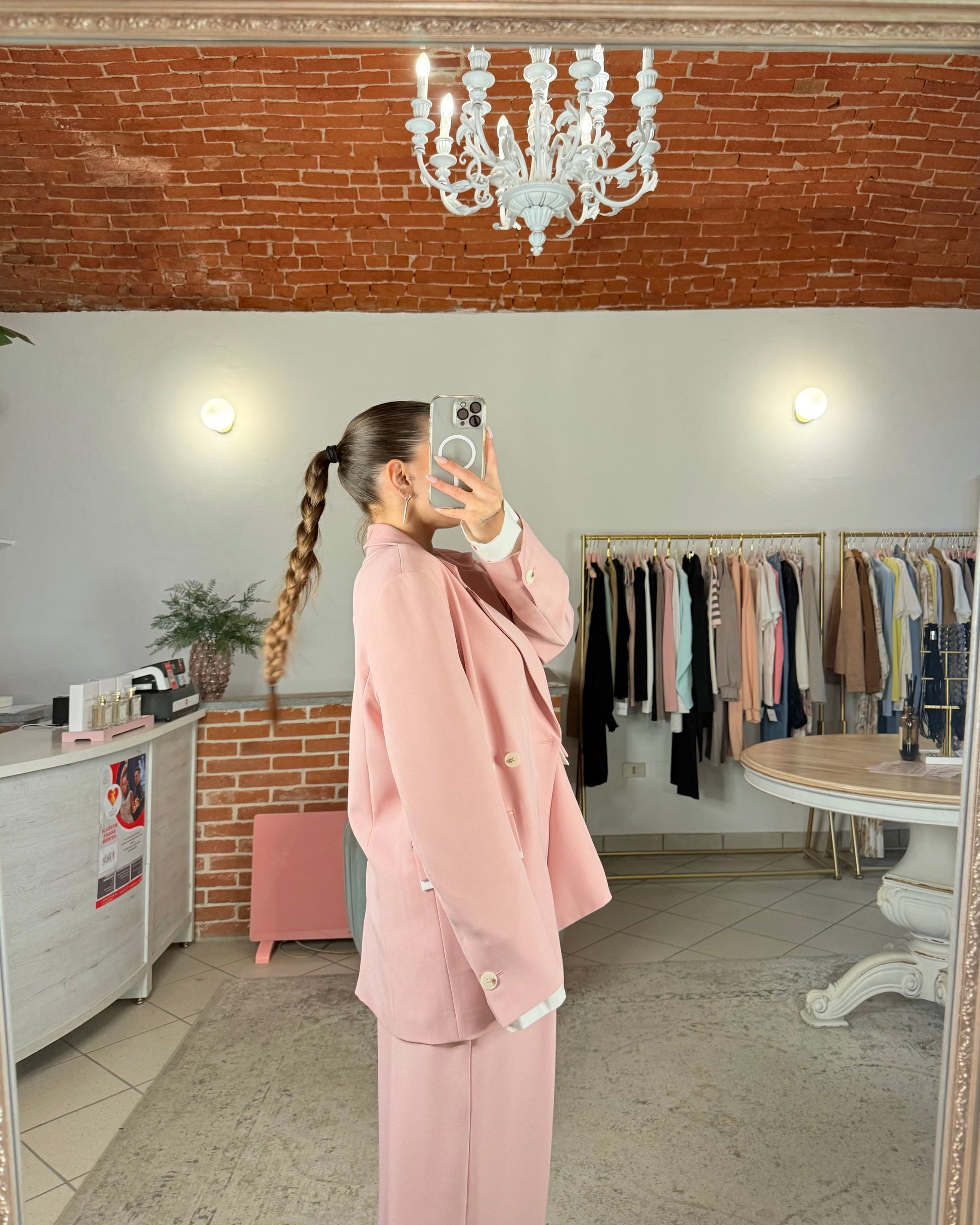 Tailleur sartoriale con inserti in camicia bianca nelle maniche (si possono rimuovere) e nelle tasche (da scucire).