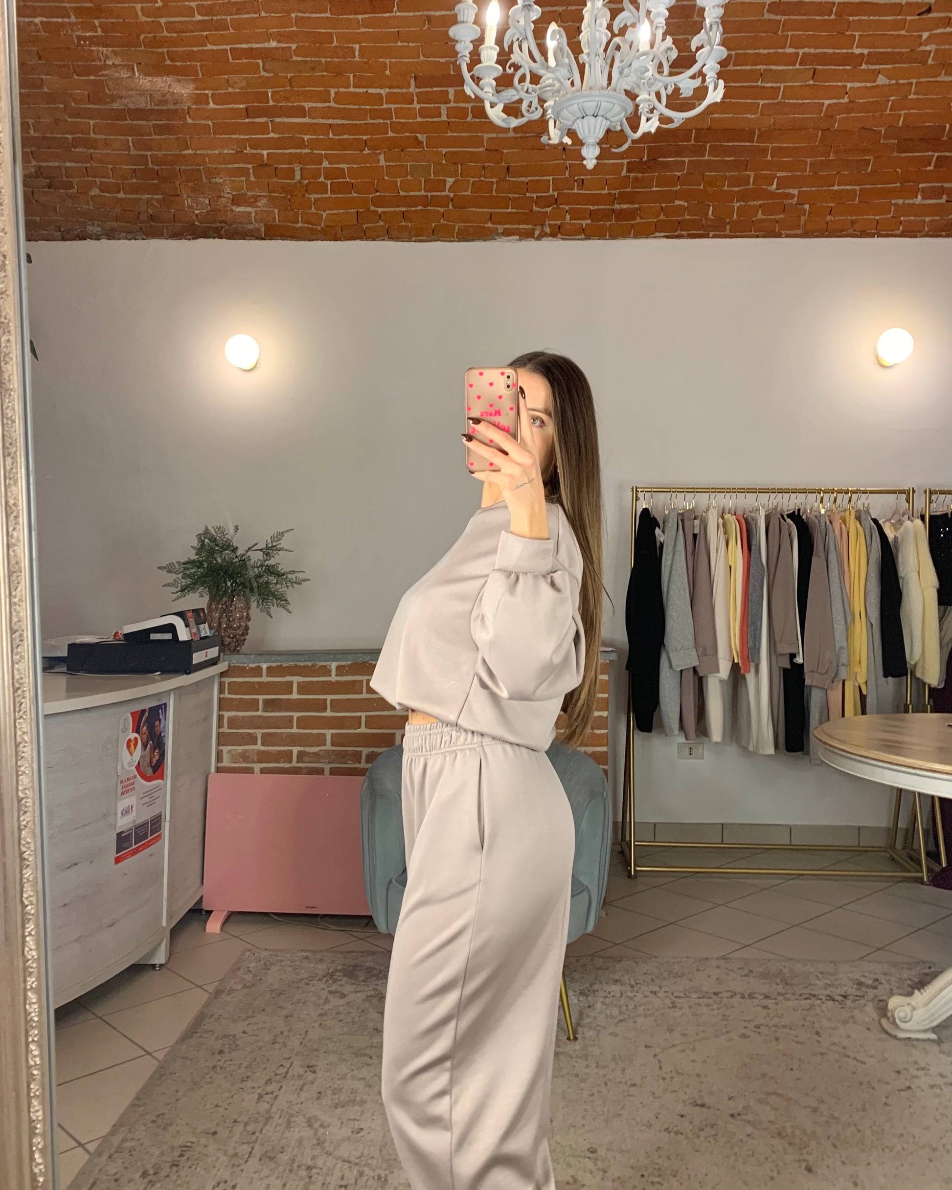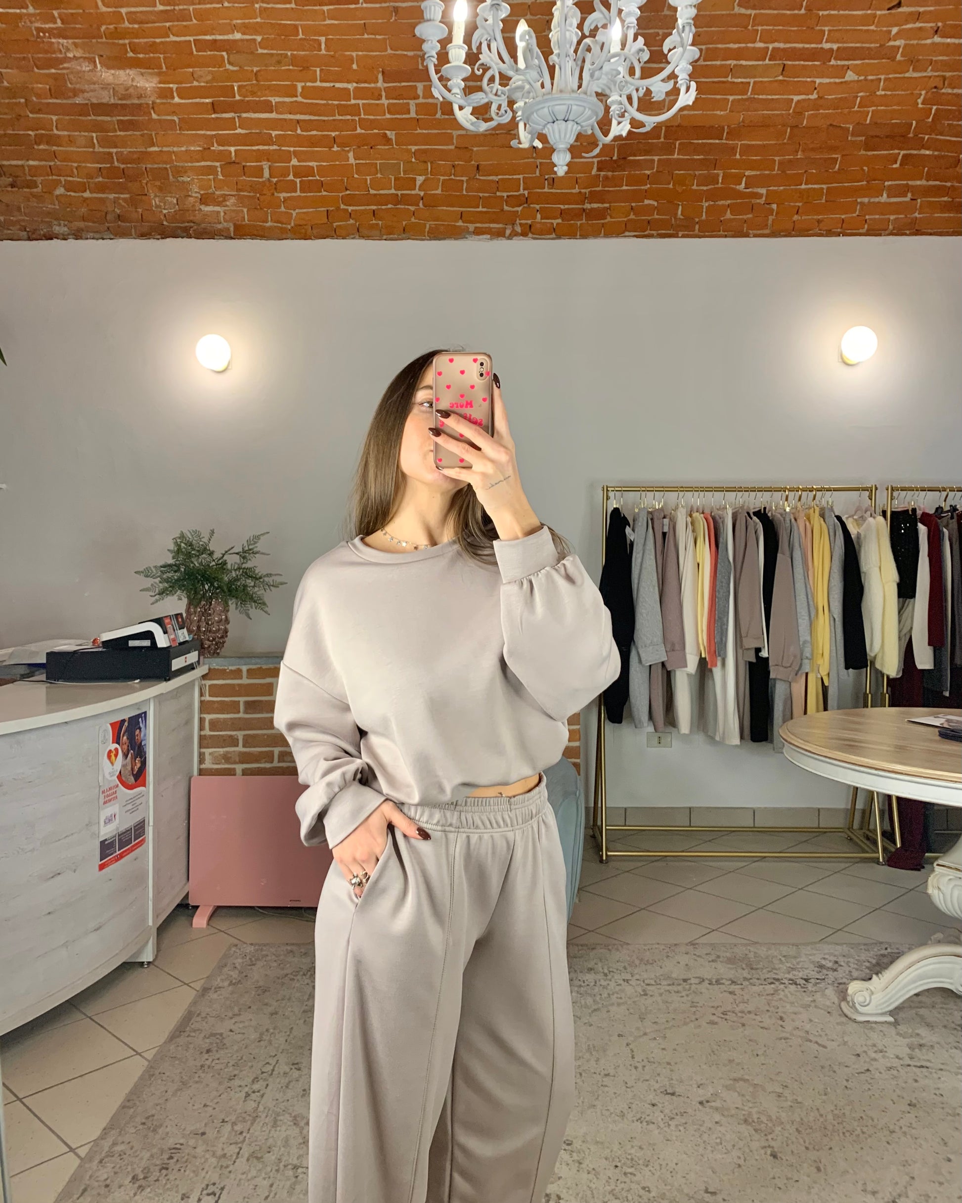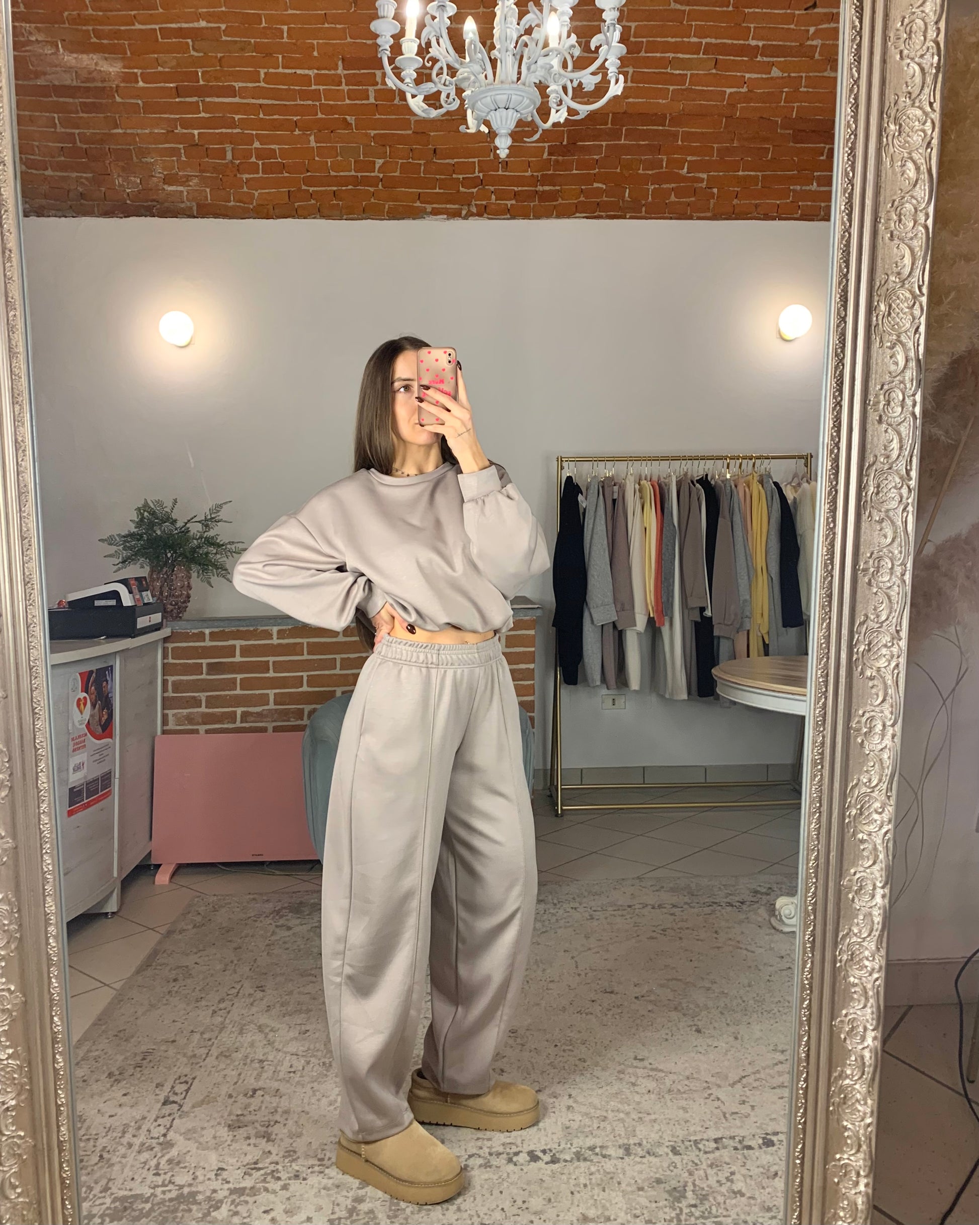 Tuta in misto viscosa composta da una felpa crop a palloncino ed un pantalone baggy con impunture, elastico in vita e tasche laterali.