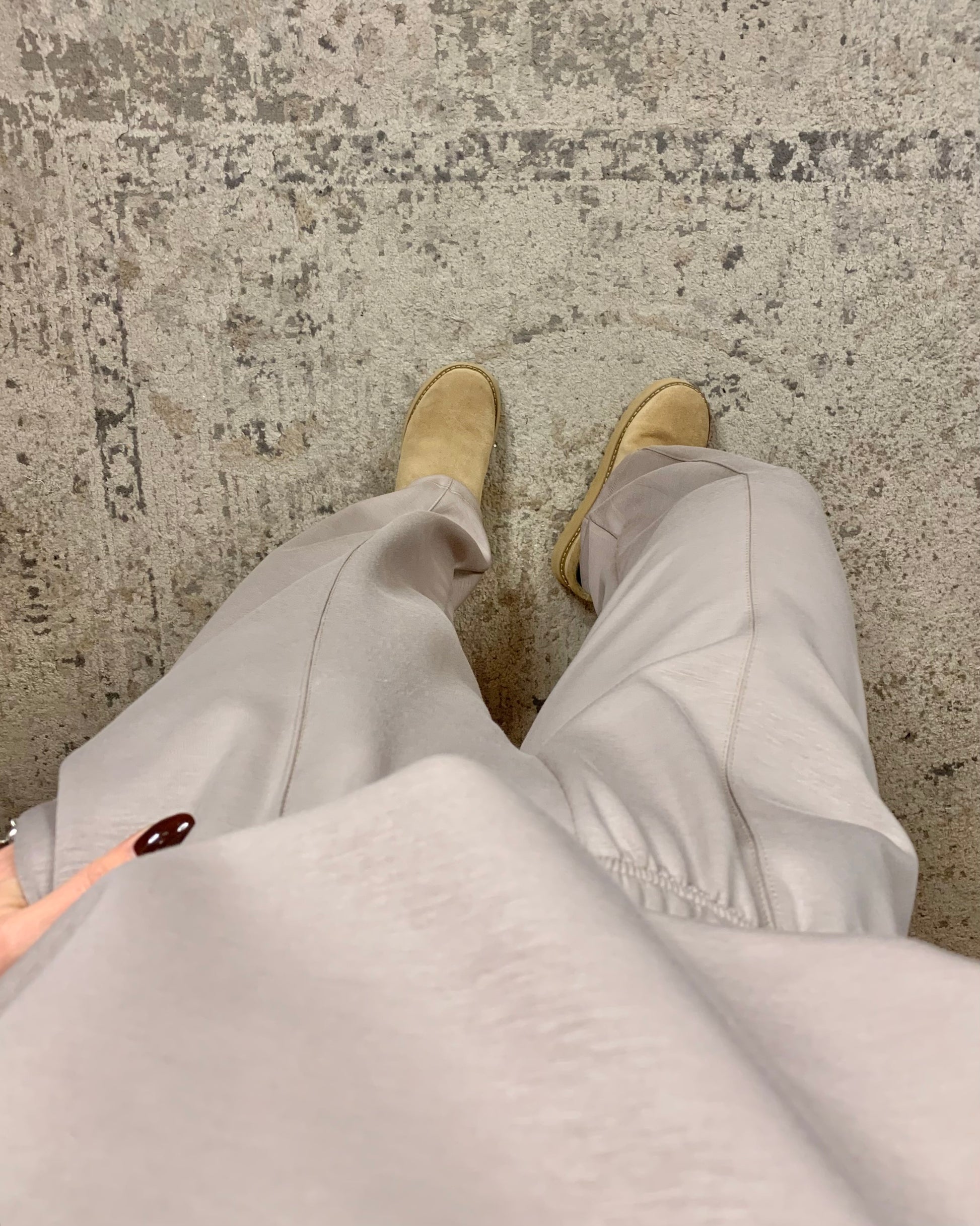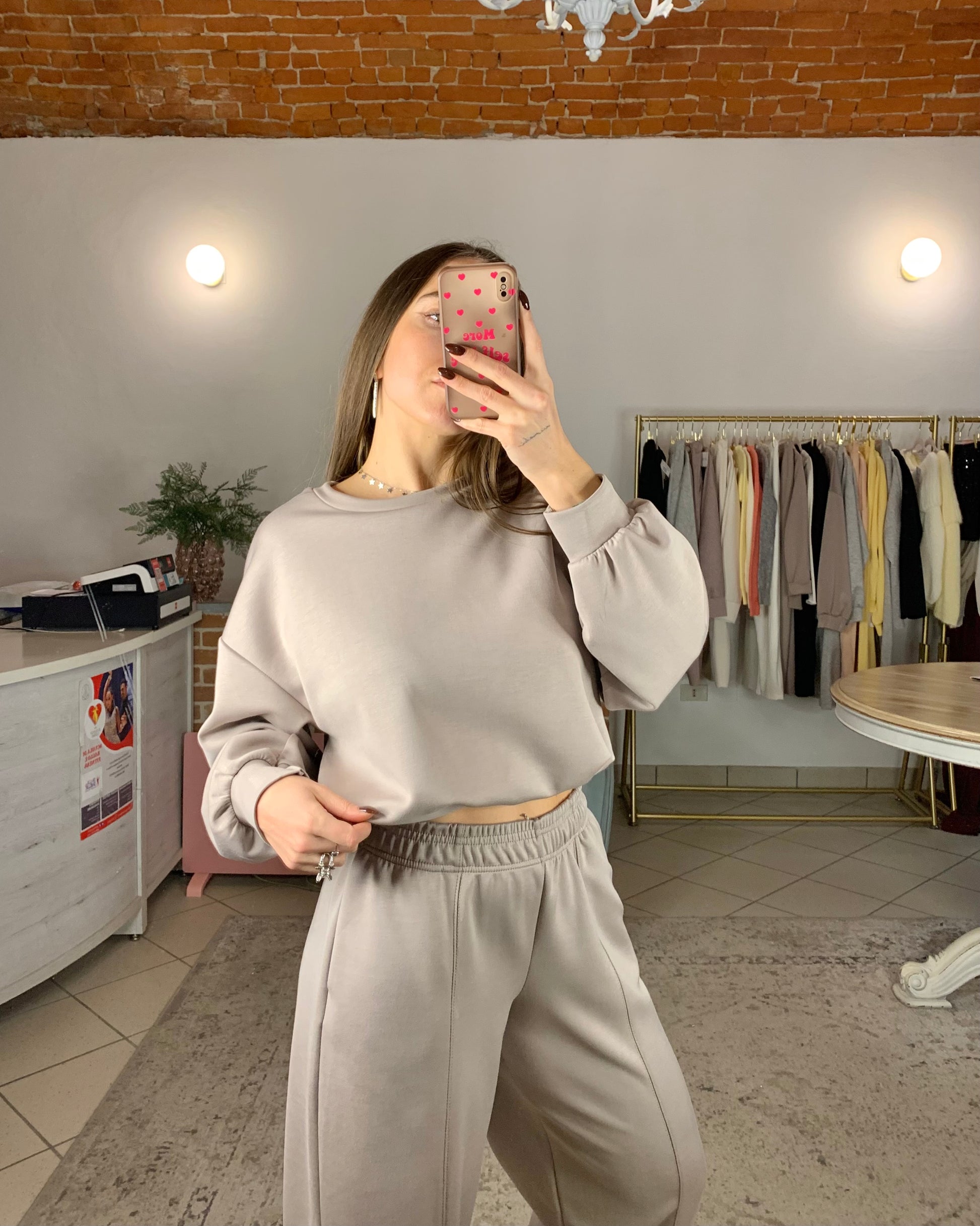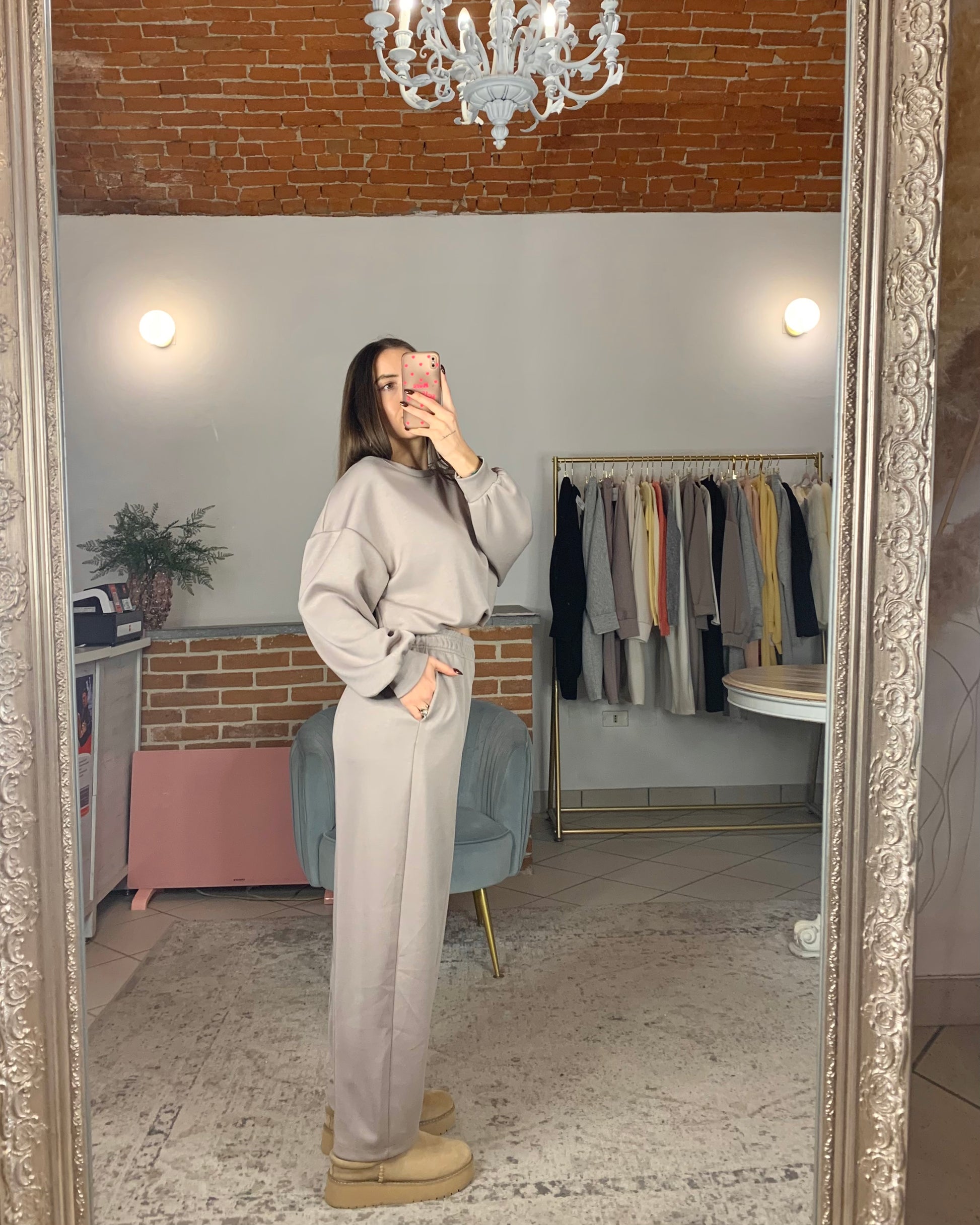 Tuta in misto viscosa composta da una felpa crop a palloncino ed un pantalone baggy con impunture, elastico in vita e tasche laterali.