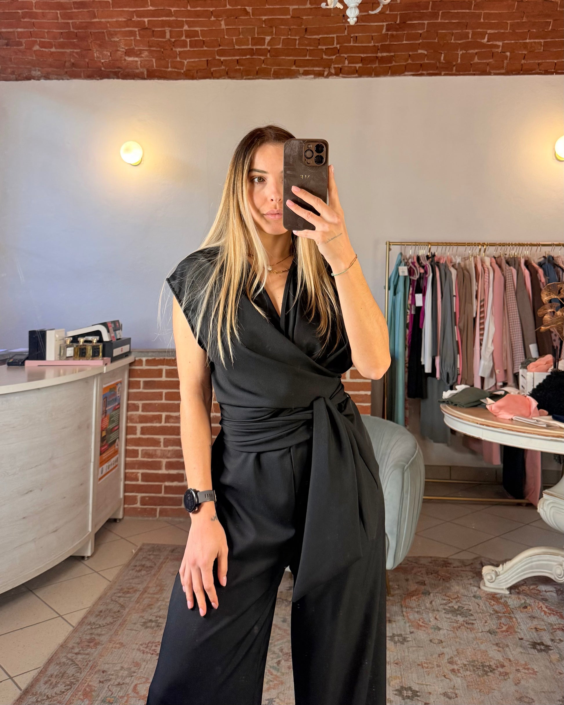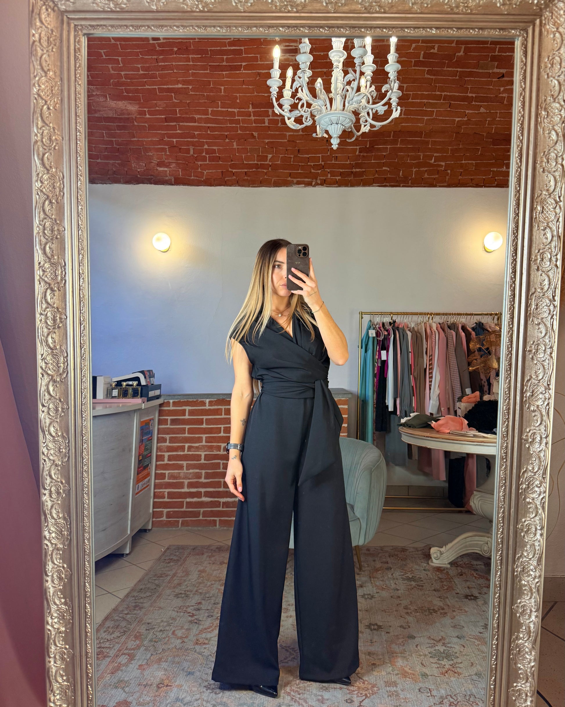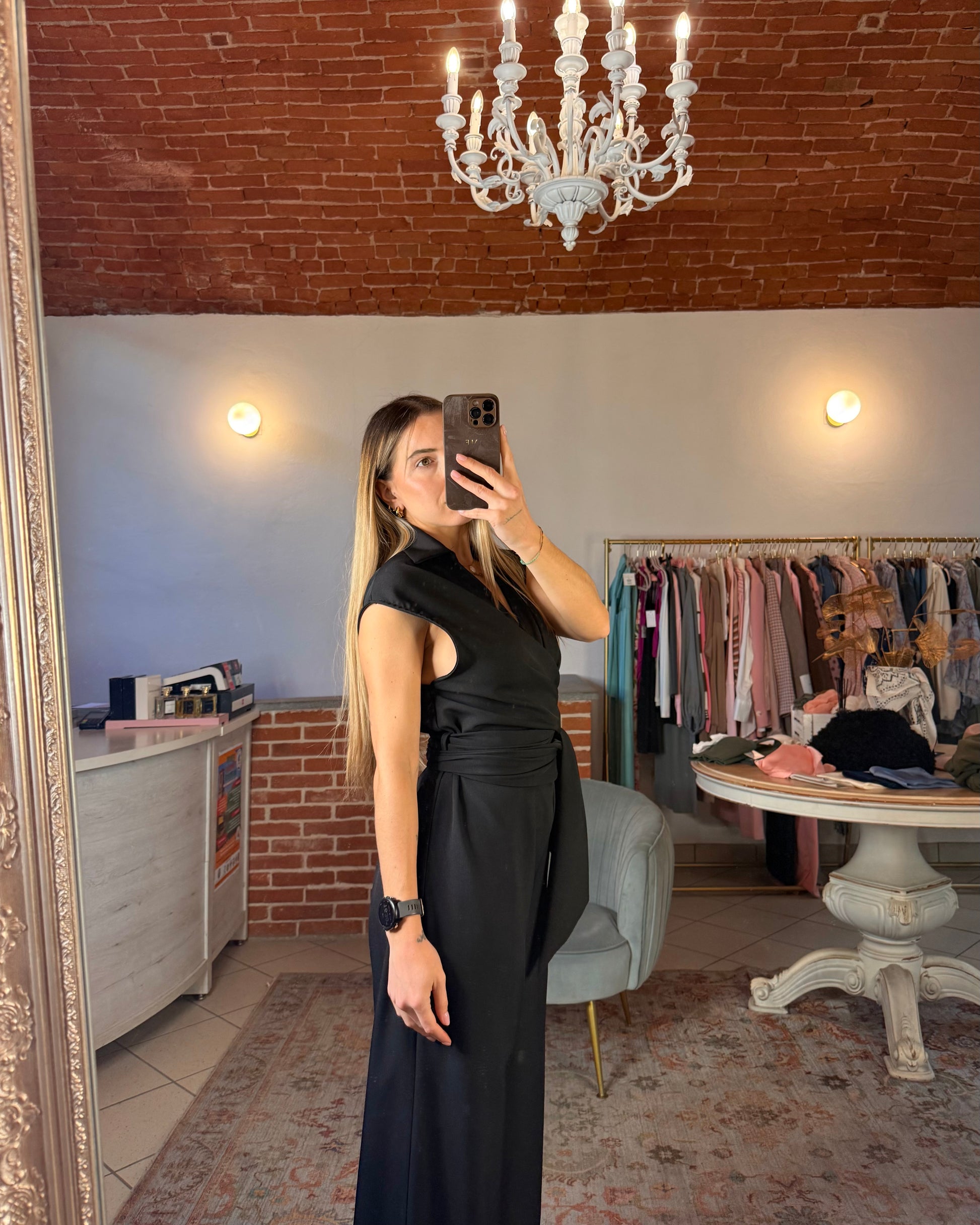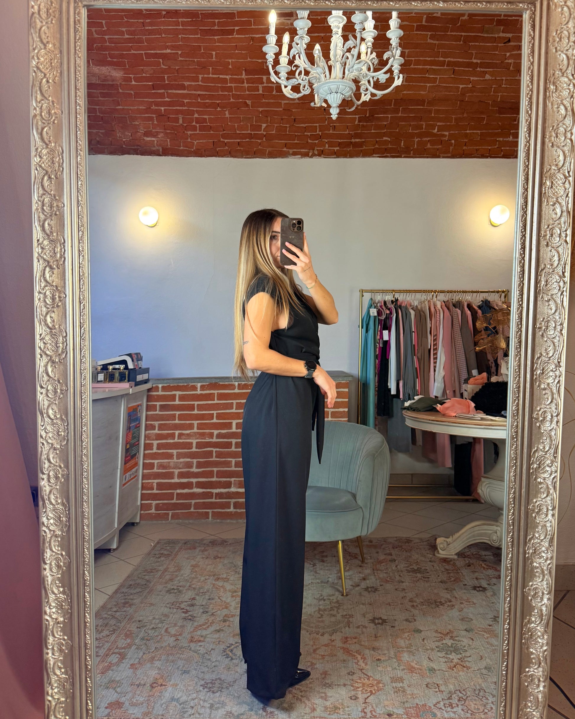 Tuta intera con fusciacca da annodare in vita in tessuto fluido.